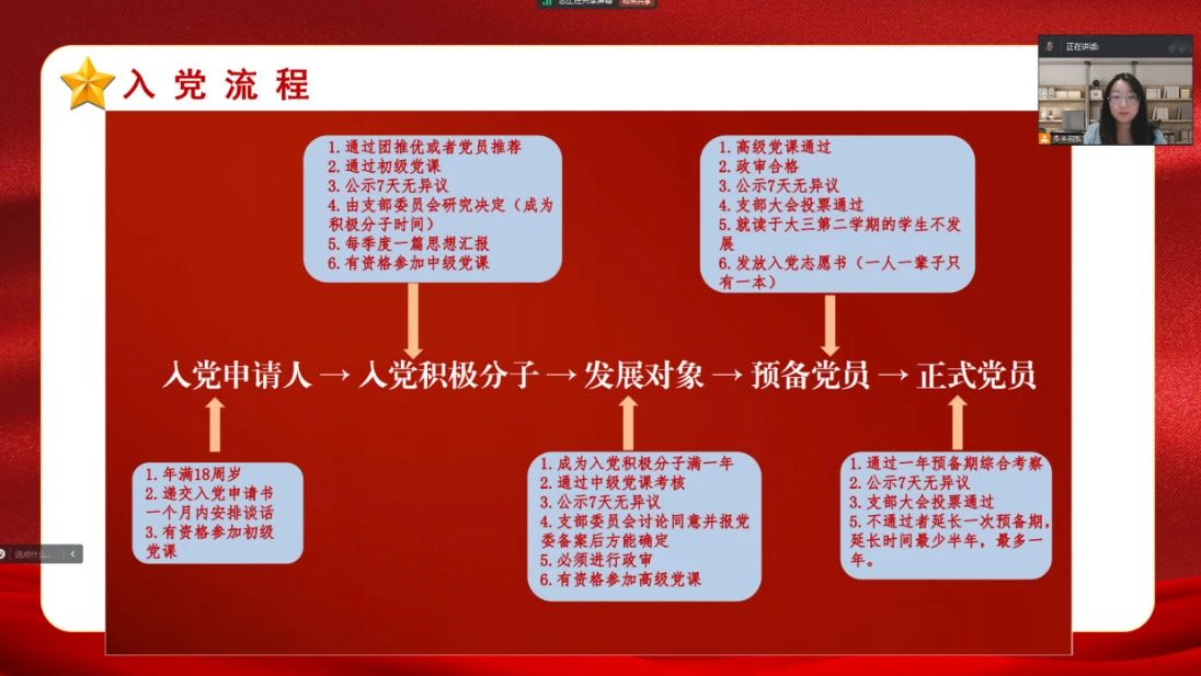 何泓老师对申请入党、入党积极分子的确定和培养教育、发展对象的确定和考察、预备党员的接收以及预备党员的教育考察和转正做了详细讲解。