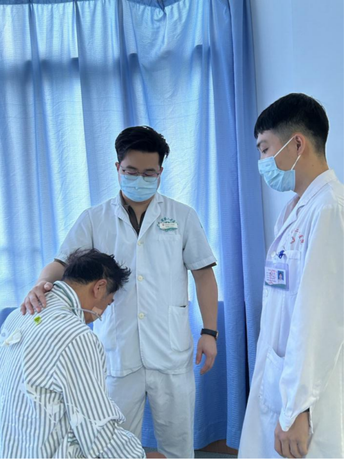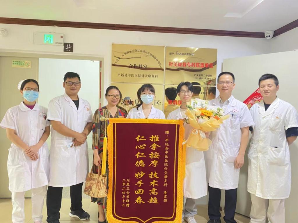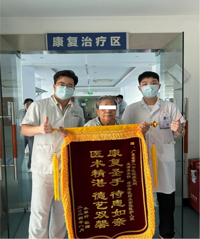 2024年7月9日,康复治疗科接收了一位特别的患者——朱婆婆,她因脑卒中出血而右侧躯体时常疼痛,并伴有肢体活动功能的严重障碍。在带教王老师的指导下,潘宁华及他的同事为朱婆婆定制了一套全面的康复治疗方案。康复过程中,朱婆婆积极配合治疗,而潘宁华同学则始终密切关注着她的病情变化,每日认真执行着康复计划中的每一项措施。 经过一段时间的共同努力,朱婆婆的病情出现了显著的改善。得知这一好消息后,朱婆婆的家属深感康复科全体医务人员的辛勤付出与无私奉献,并于8月22日午后,向王老师及潘宁华同学赠送了一面锦旗。