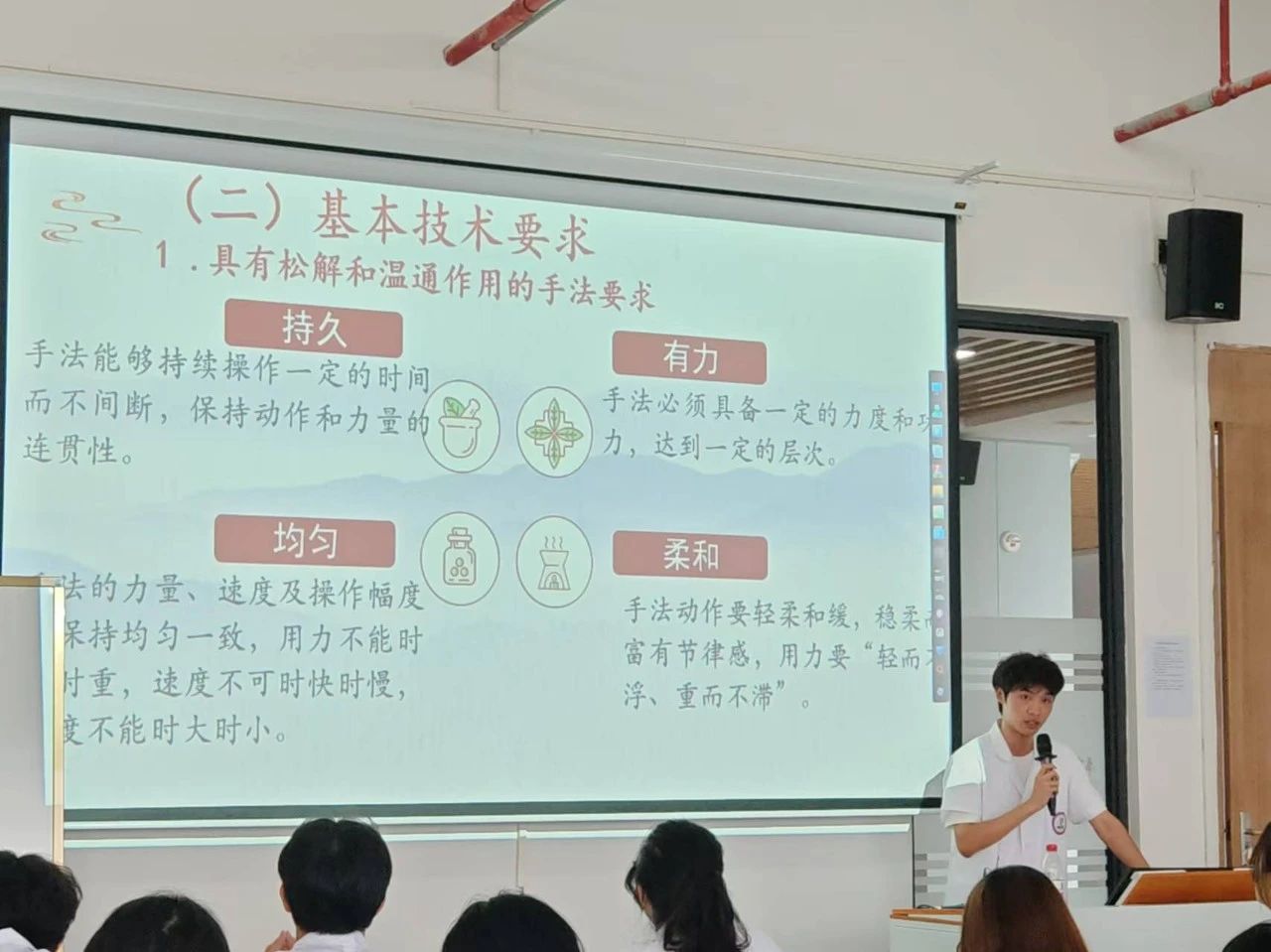 课堂伊始,许梓淳部长为队员们全面介绍推拿保健的作用原理以及理论知识。为队员们构建起关于推拿保健的基本知识框架,让队员们对于推拿按摩有着更深一层的认识与理解。