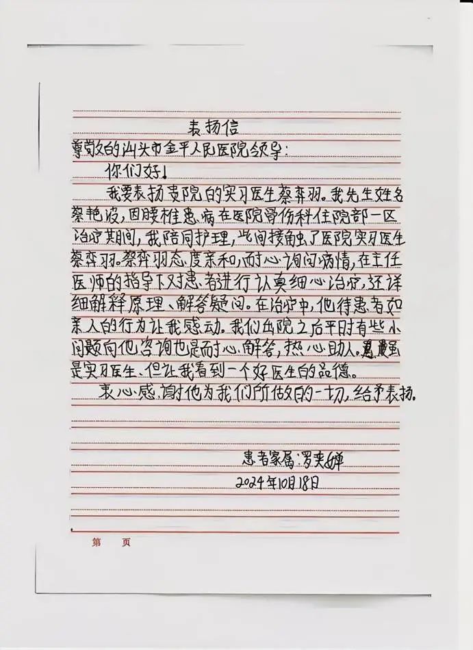 蔡弈羽同学在汕头市金平区人民医院骨伤科实习期间,以其耐心细致的工作态度和高尚的医德,赢得了患者及家属的广泛赞誉。2024年10月18日,患者蔡艳波的家属罗奕婵女士亲自撰写了表扬信,对蔡弈羽同学在治疗过程中的专业能力和亲切服务表示了衷心的感谢。罗女士在信中提到,蔡弈羽同学不仅在治疗中表现出了极高的专业素养,而且在解答疑问和提供咨询时也总是耐心细致,热心助人,展现了一名优秀医生的品德。