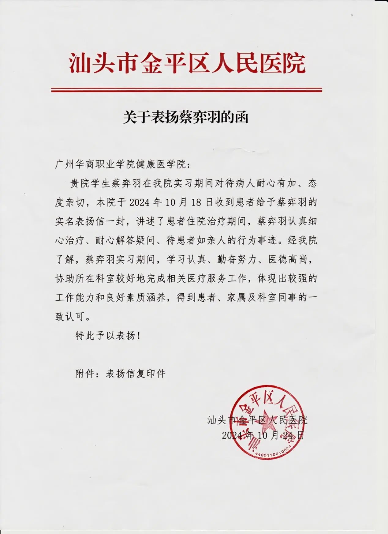 汕头市金平区人民医院在表扬信中也对蔡弈羽同学的表现给予了肯定,称赞他在实习期间学习认真、勤奋努力,协助所在科室较好地完成了相关医疗服务工作,体现出了较强的工作能力和良好的素质涵养。医院特别强调了蔡弈羽同学对待病人的耐心和亲切,以及他在解答患者疑问时的耐心和专业,认为他的行为事迹值得表扬。