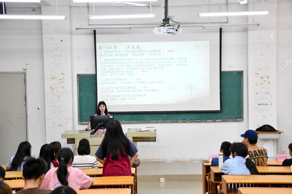 本次决赛有幸邀请到学院的多位领导及教师担任评委,包括叶雪兰副院长、刘力老师、钟林江老师,以及活动嘉宾杨滔老师、伍杰莹老师、张菀鑫老师、黄惠珠老师和彭苑霞老师。现场气氛紧张激烈,参赛选手们全神贯注,面对涉及中医药基础理论、中药药材识别等多个领域的题目,他们展现出了深厚的专业知识和素养。在答题环节中,选手们凭借精准的判断和丰富的知识储备,给出了正确答案。