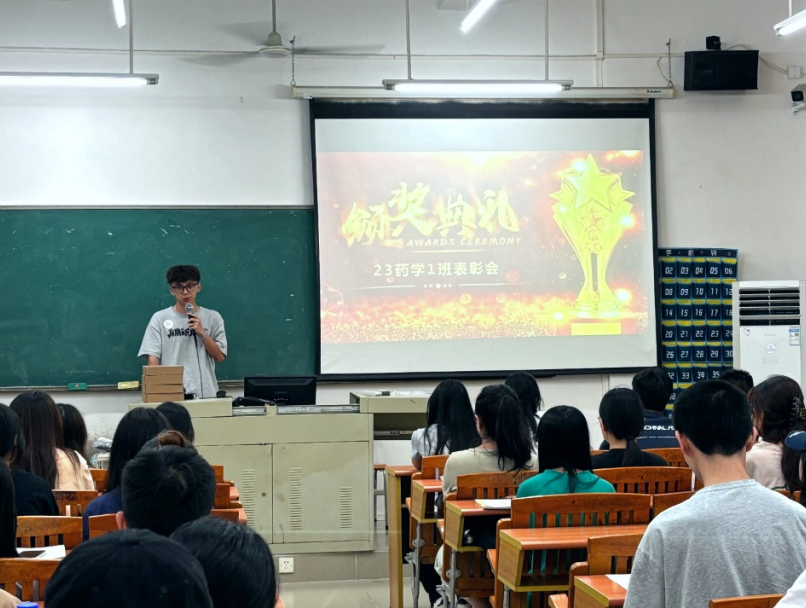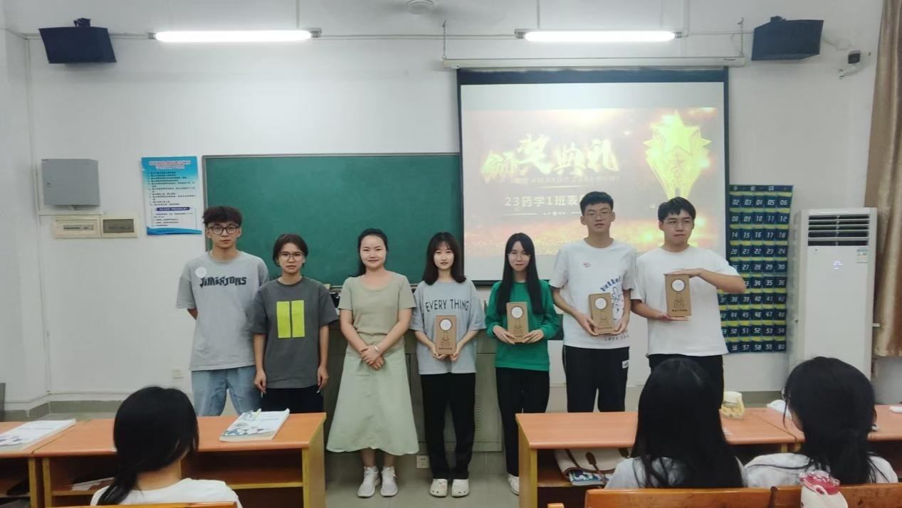 辅导员杨敏娟老师,班主任刘淑英老师和23药学1班全体同学在博b405进行颁奖仪式。班长陈梓逸主持了该活动,他肯定了全班同学100%参与的积极性,也感谢大家一起通过游戏活动的形式营造团结友爱的班级文化氛围,并鼓励没有获奖的同学不要气馁,后面的班级活动积极展示自我。