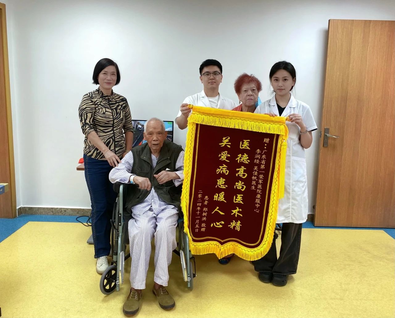 近日,健康医学院22级康复治疗吴佳帆同学在广东省第一荣军医院实习期间,因出色的康复治疗技术和贴心的照顾,赢得了患者及家属的广泛赞誉,并收到家属感谢金与锦旗。