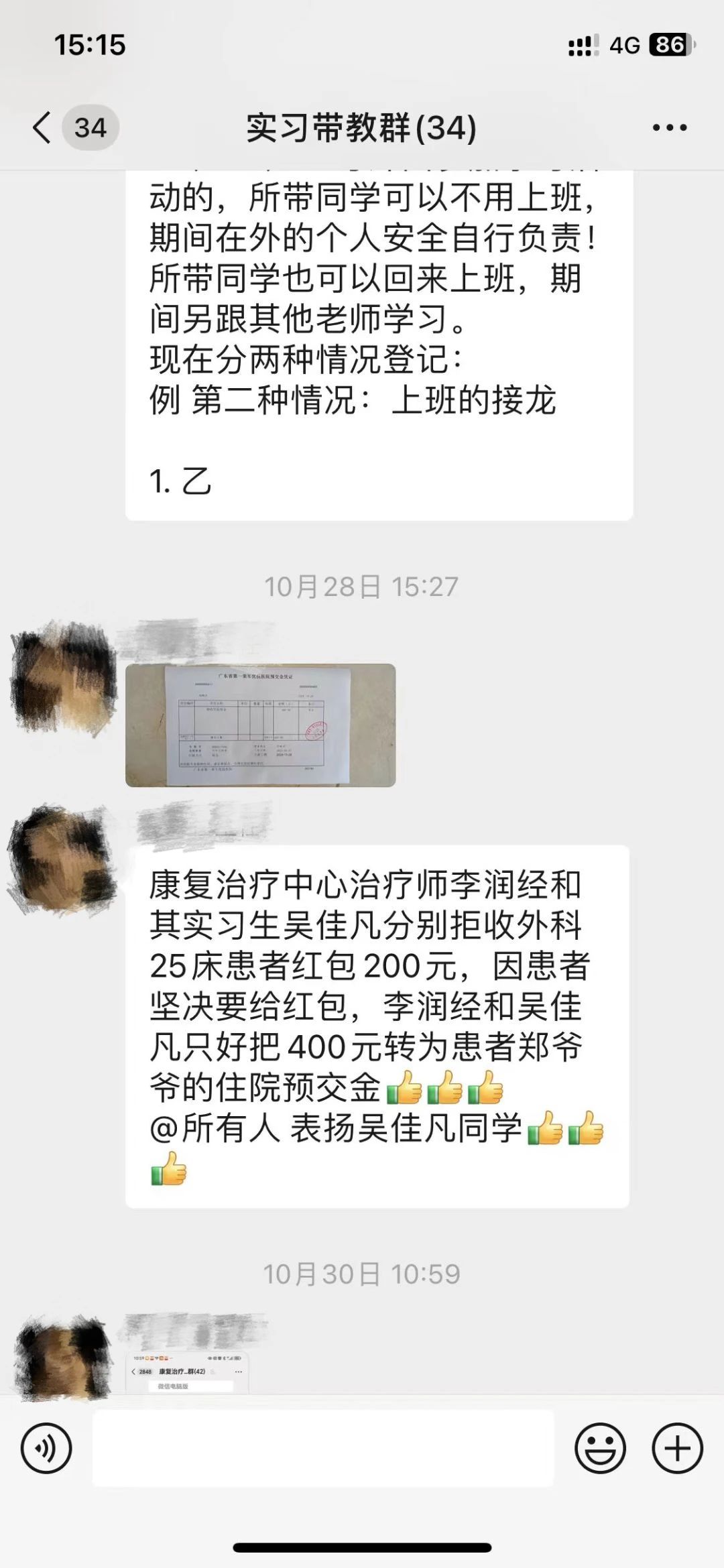 患者家属出于感激之情给予吴佳帆同学200元现金红包,吴同学坚决拒绝。但为了不增加患者情绪负担,最终暂时收下红包,并立即向带教老师汇报。广东省第一荣军医院随后将这笔钱转为患者郑爷爷的住院预交金。吴同学的行为受到医院和带教老师的表扬,她坚信个人价值在于服务他人。