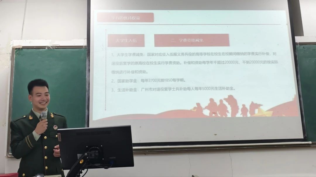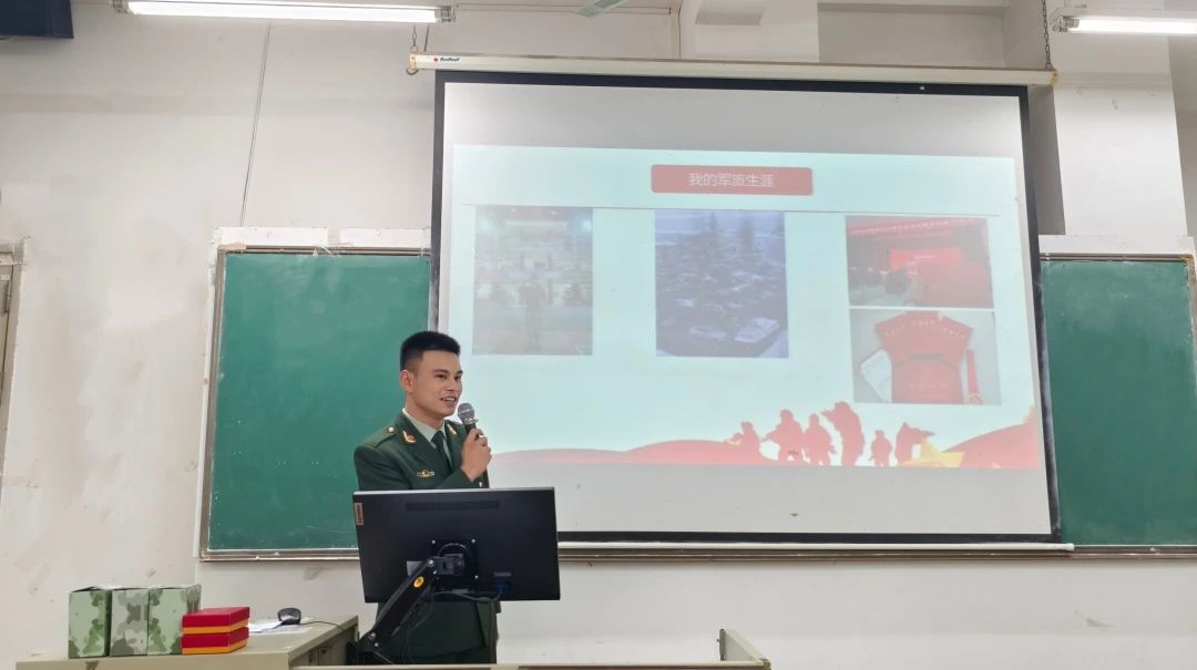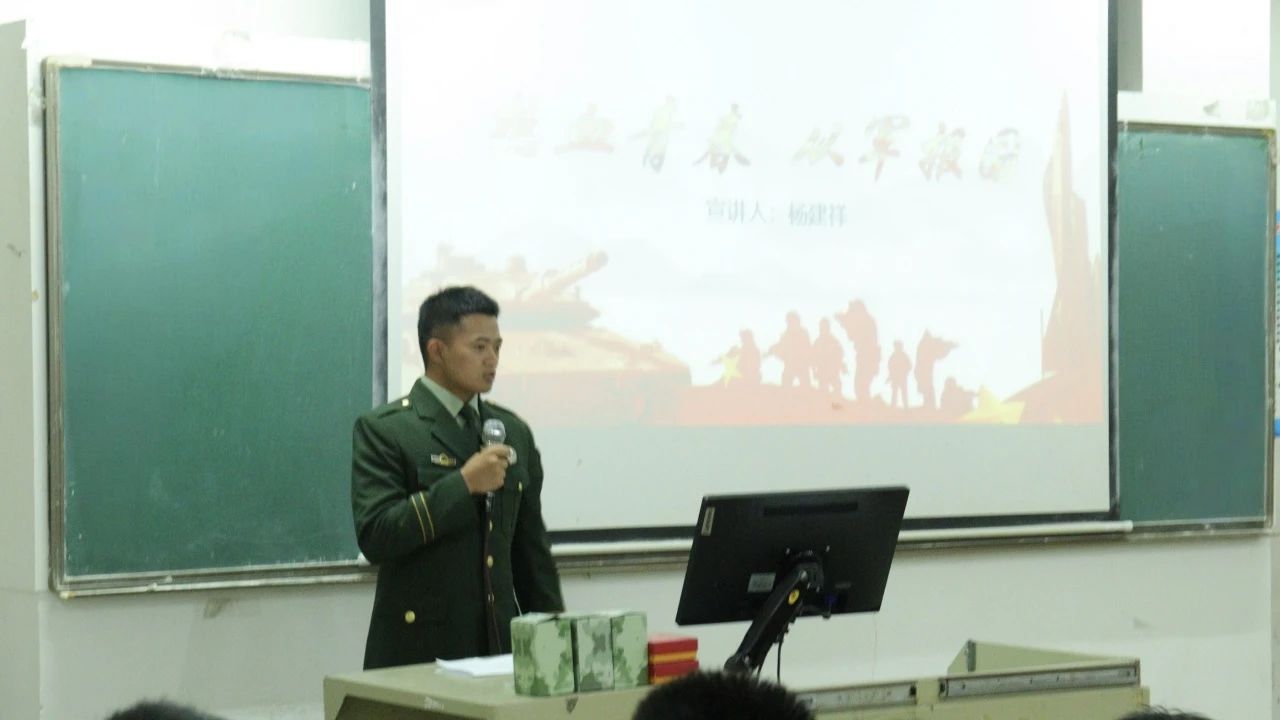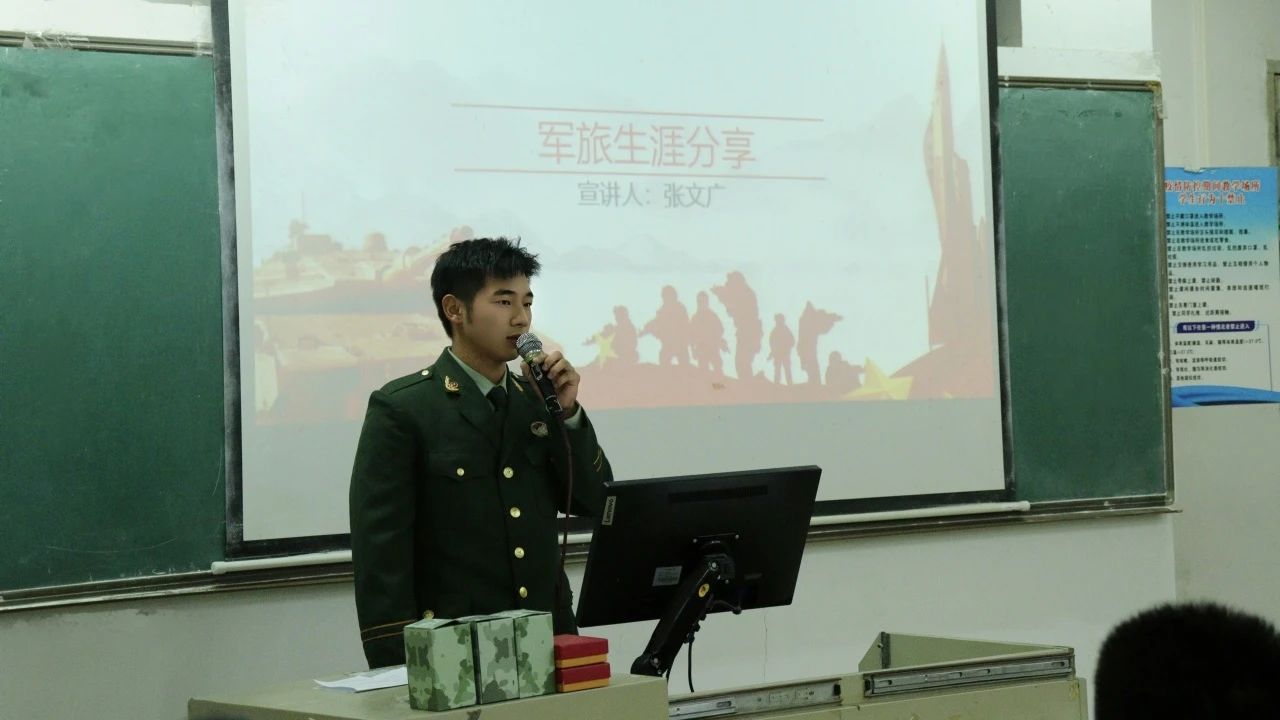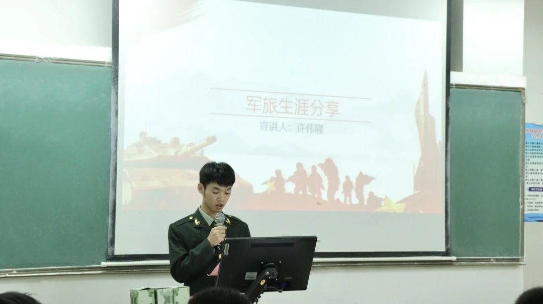 宣讲员李权辉通过分享与战友日常训练和参加培训的故事,并号召同学们响应征兵号召,投身军旅,收获宝贵战友情,践行爱国志。