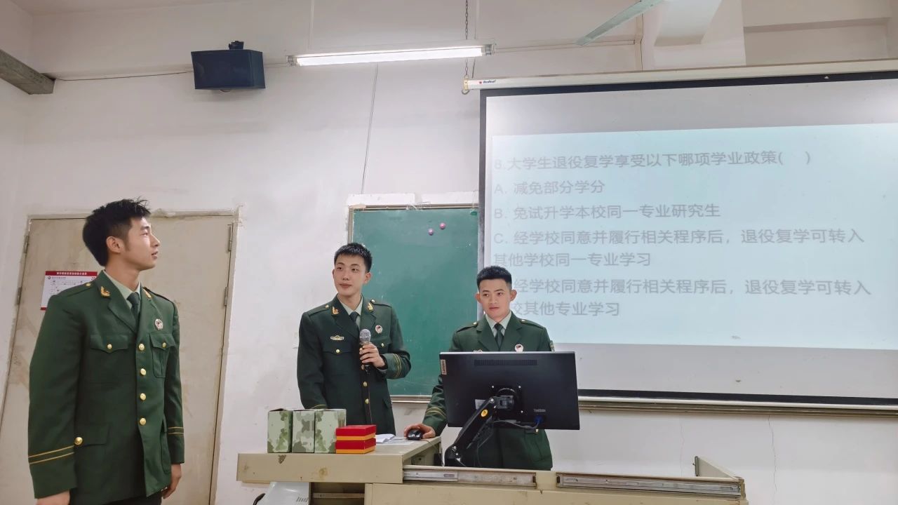 为积极响应党和国家征兵工作的号召,引导青年学生踊跃参军、帮助大学生深入了解参军入伍政策,激发爱国主义情感。健康医学院国防教育宣讲团11月12日在博A207开展了主题为“青春正当时,参军绽芳华"的线下征兵动员宣讲会暨现场答疑活动。本次活动由健康医学院国防教育宣讲团陈宽主持。出席本次活动的有健康医学院国防宣讲团指导老师杨敏娟老师。