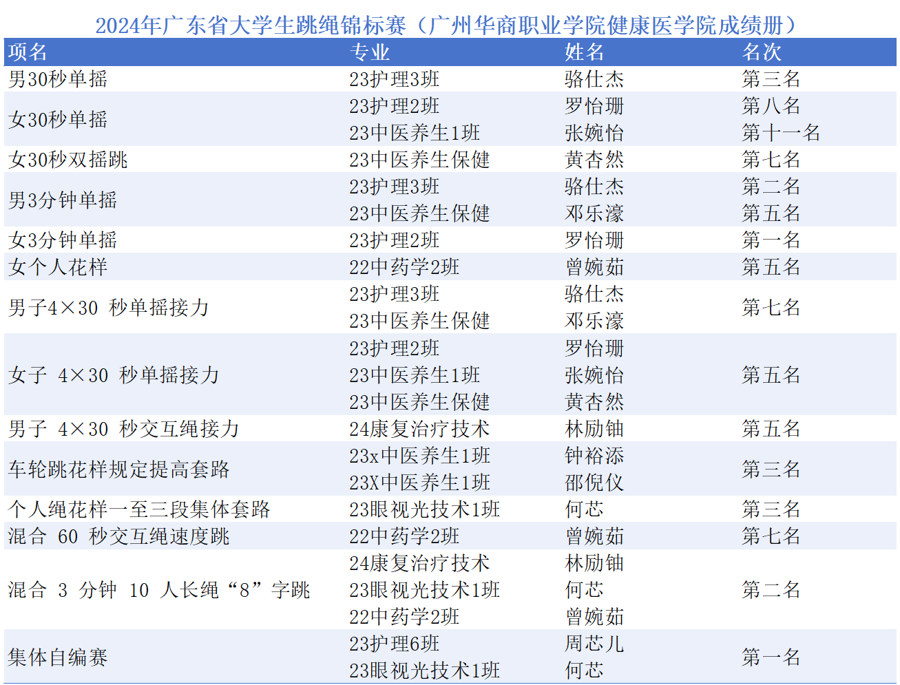 我校跳绳队积极派代表参赛,在比赛过程中,他们不畏强手,奋勇争先,经过一轮轮紧张而激烈的角逐,最终斩获11枚金牌、11枚银牌和13枚铜牌,荣获丙组团体总分一等奖。其中,有3枚金牌,4枚银牌,4枚铜牌来自健康医学子。