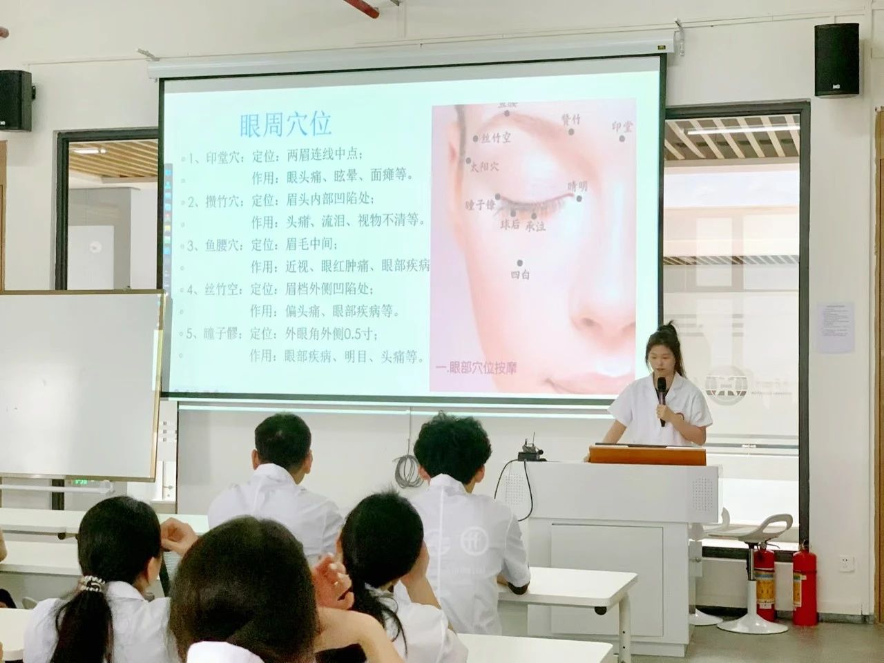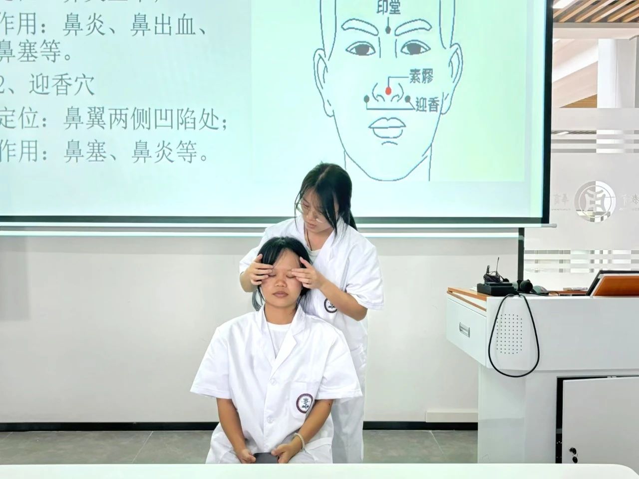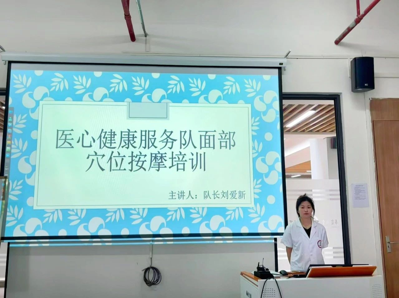 在培训过程中,刘爱新队长特别强调了面部穴位的重要性,并对每个穴位的具体位置进行了细致讲解。她不仅借助文字、照片和视频进行说明,还一一示范,确保队员们能够精确掌握每个穴位的确切位置。此外,刘爱新队长还邀请队员们上台,亲身体验穴位按摩的感觉,以便更深入地理解和记忆,随后队员们积极参与,互相按摩实践。