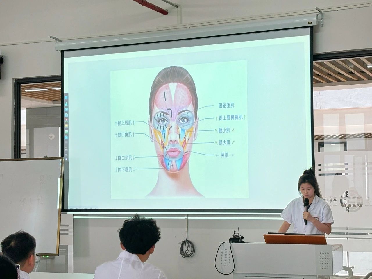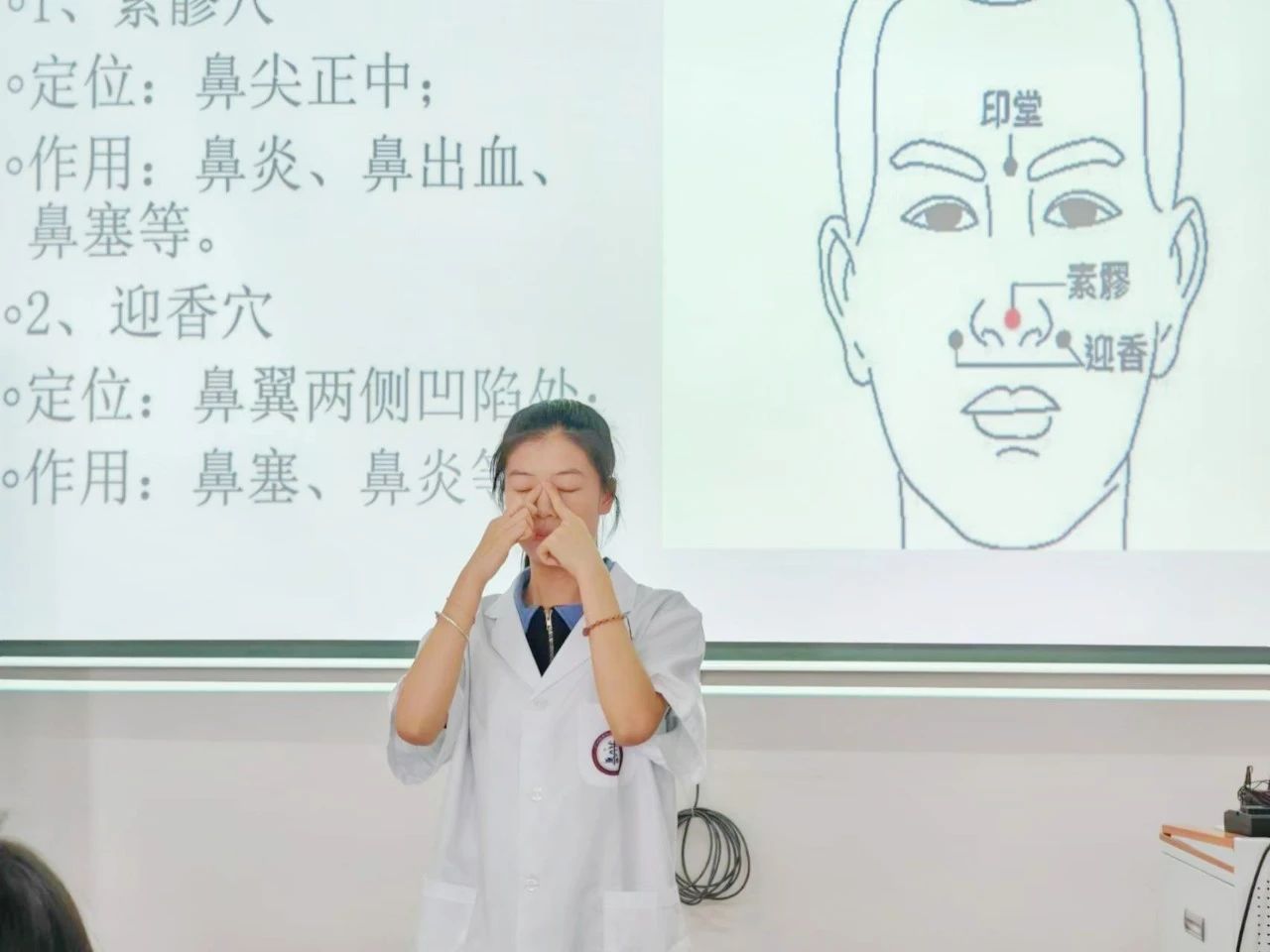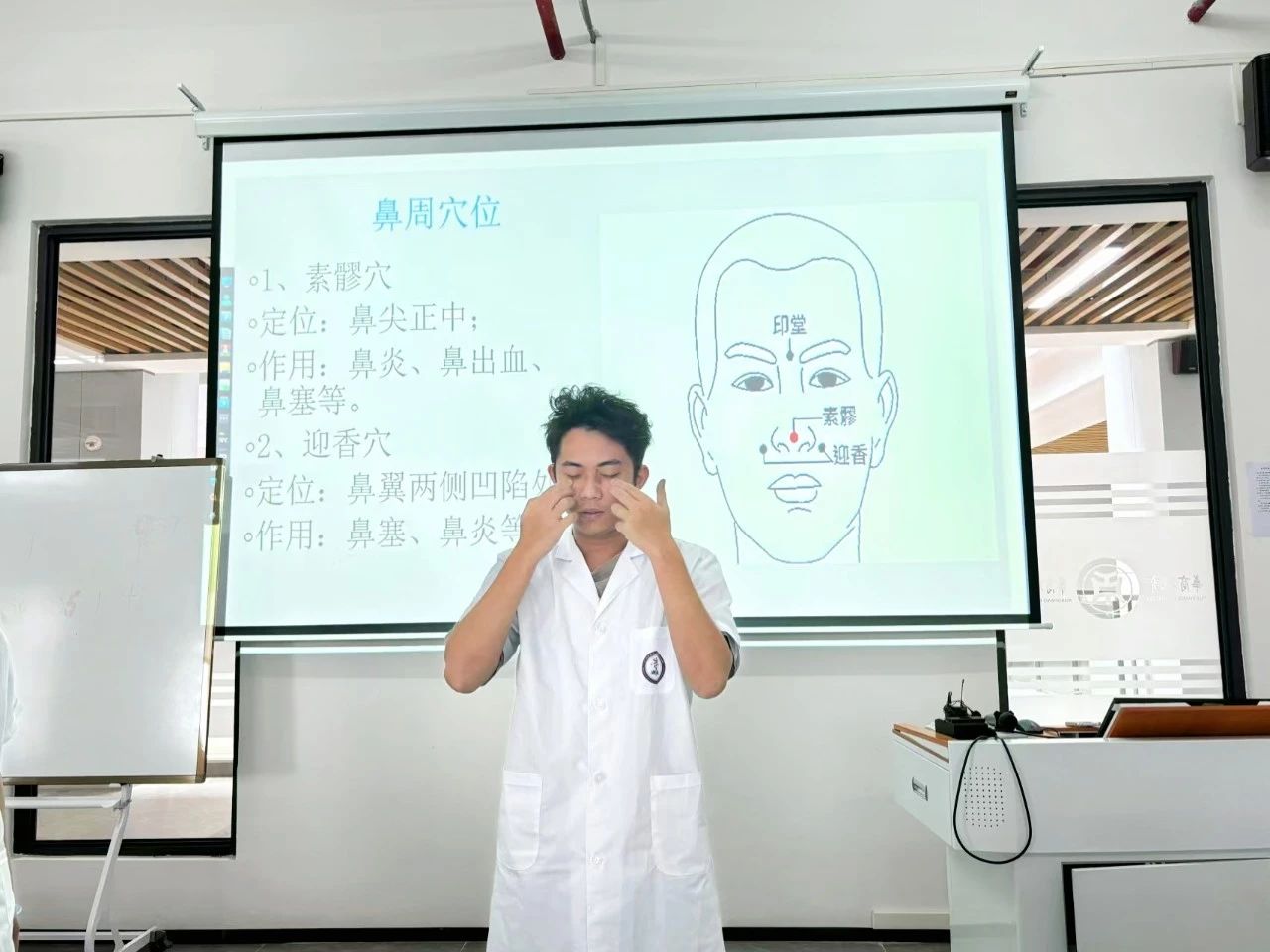 在培训过程中,刘爱新队长特别强调了面部穴位的重要性,并对每个穴位的具体位置进行了细致讲解。她不仅借助文字、照片和视频进行说明,还一一示范,确保队员们能够精确掌握每个穴位的确切位置。此外,刘爱新队长还邀请队员们上台,亲身体验穴位按摩的感觉,以便更深入地理解和记忆,随后队员们积极参与,互相按摩实践。