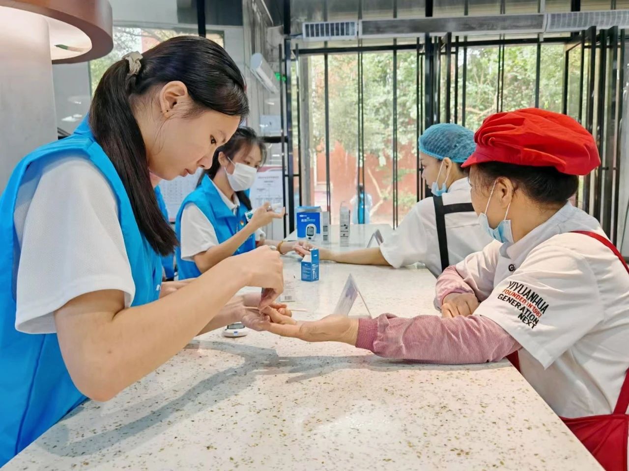 志愿者们希望通过这次测血糖量血压的活动,让全体师生和后勤管理人员对高血糖、高血压有进一步的了解,以及向他们普及高血糖、高血压会引发的各种并发症,进而增强大家守护健康的意识。