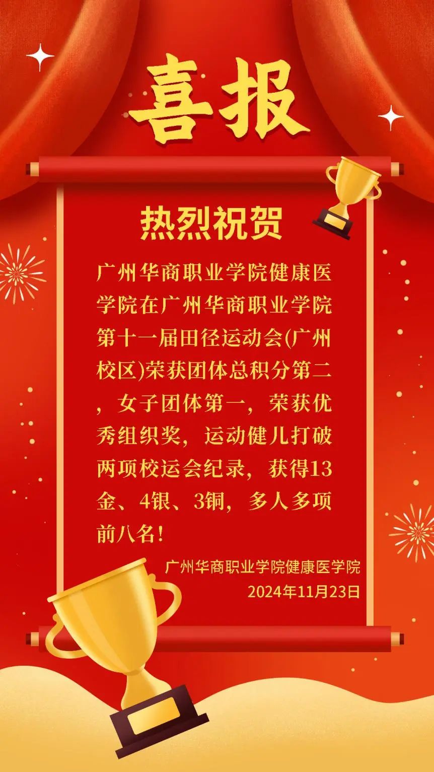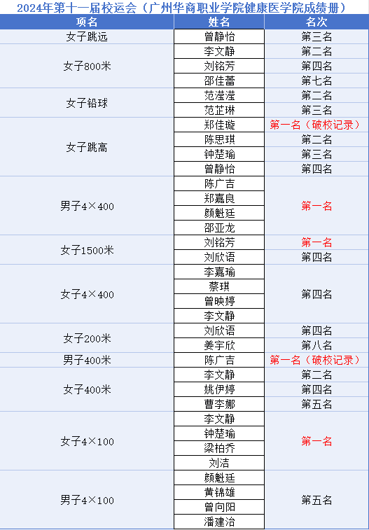经过两天的激烈角逐,广州华商职业学院第十一届田径运动会的各项赛事圆满结束。健康医学院以卓越表现荣获团体总积分第二,女子团体第一,并荣获优秀组织奖,打破两项校运会纪录,共夺得13金、4银、3铜,多人多项进入前八名。