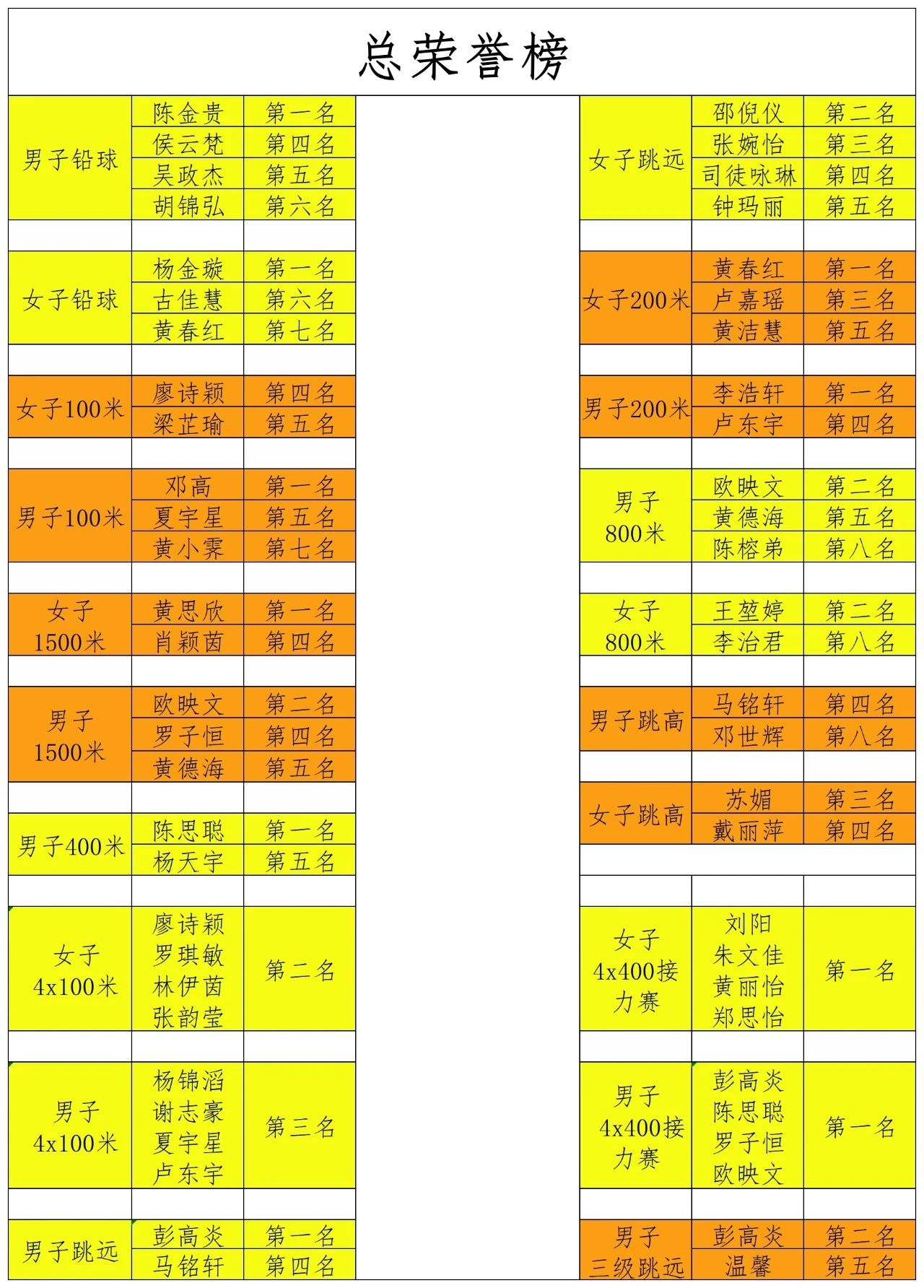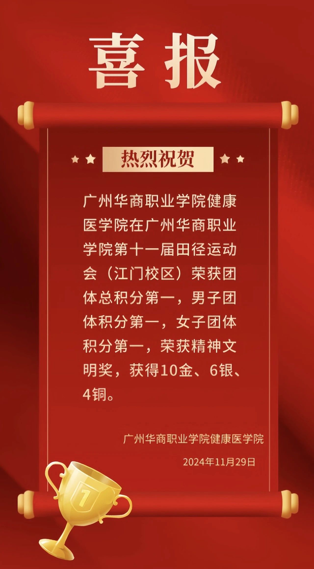 11月29日下午,经过两天的激烈比拼,广州华商职业学院第十一届田径运动会(江门校区)的各项赛事圆满结束。健康医学院荣获团体总积分第一,男子团体积分第一,女子团体积分第一,并荣获精神文明奖,共夺得10金、6银、4铜。