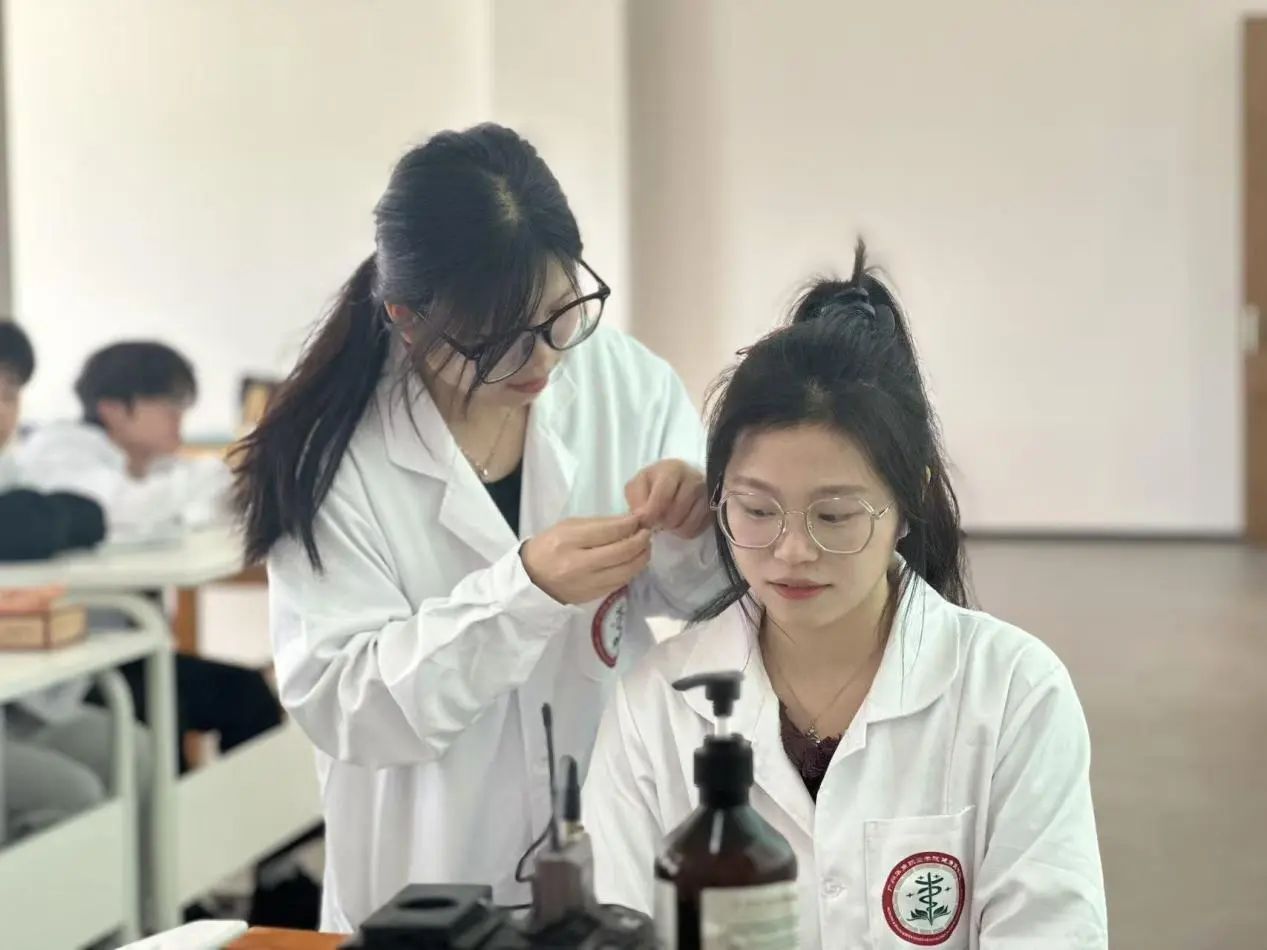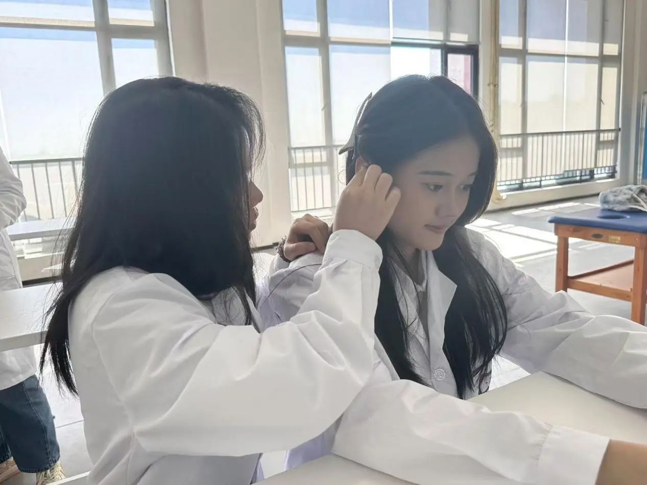 实践操作环节更是本次培训的重中之重,每位队员都有充足的机会亲自动手进行耳穴贴的操作练习。队长罗雅欣手把手地从传授耳穴贴的操作,例如通过触摸、按压来确定穴位的准确位置;到如何正确地进行耳穴贴的贴敷,包括耳部的清洁消毒、贴敷的角度与力度等细节;再到如何根据患者的反应适时调整贴敷方案,都进行了深入的实践教学。队员们相互交流操作心得,分享彼此在实践过程中遇到的问题与解决的方法,形成了良好的学习互动氛围。