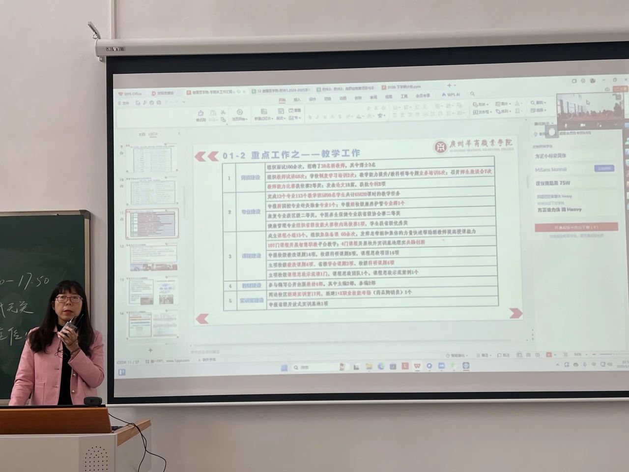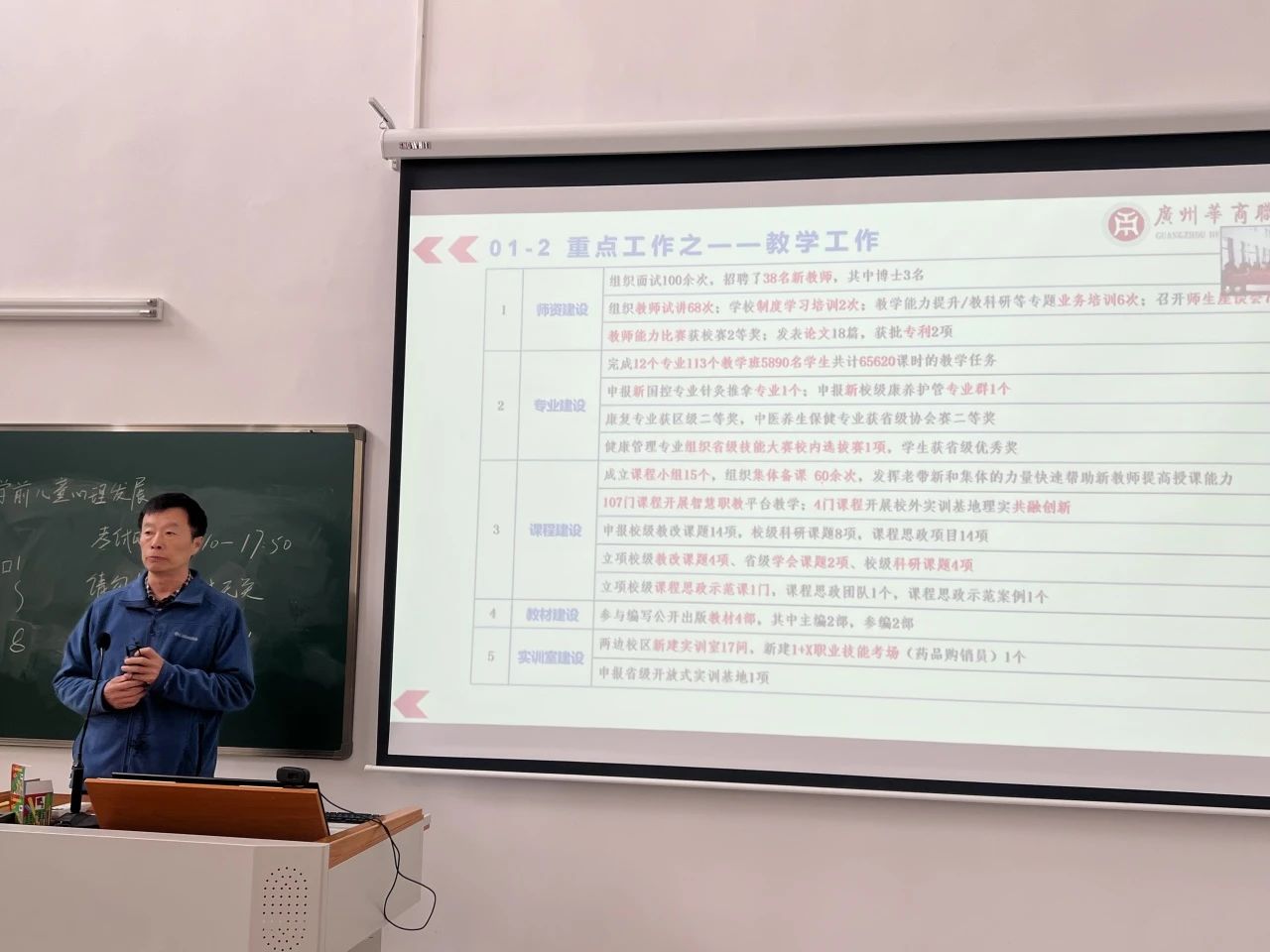 2025年1月8日中午12:30,健康医学院在广州校区博C504和江门校区文417同步召开全体教职工大会,做学期末学院工作总结及下学期计划。与会人员为健康医学院两校区全体教职工,会议由洪文艳院长主持。