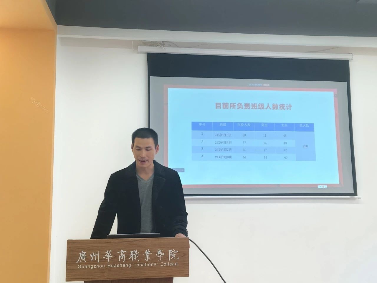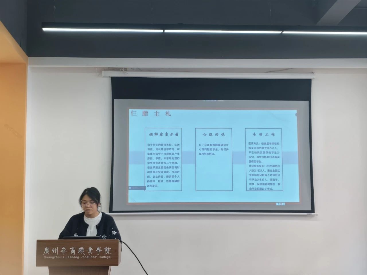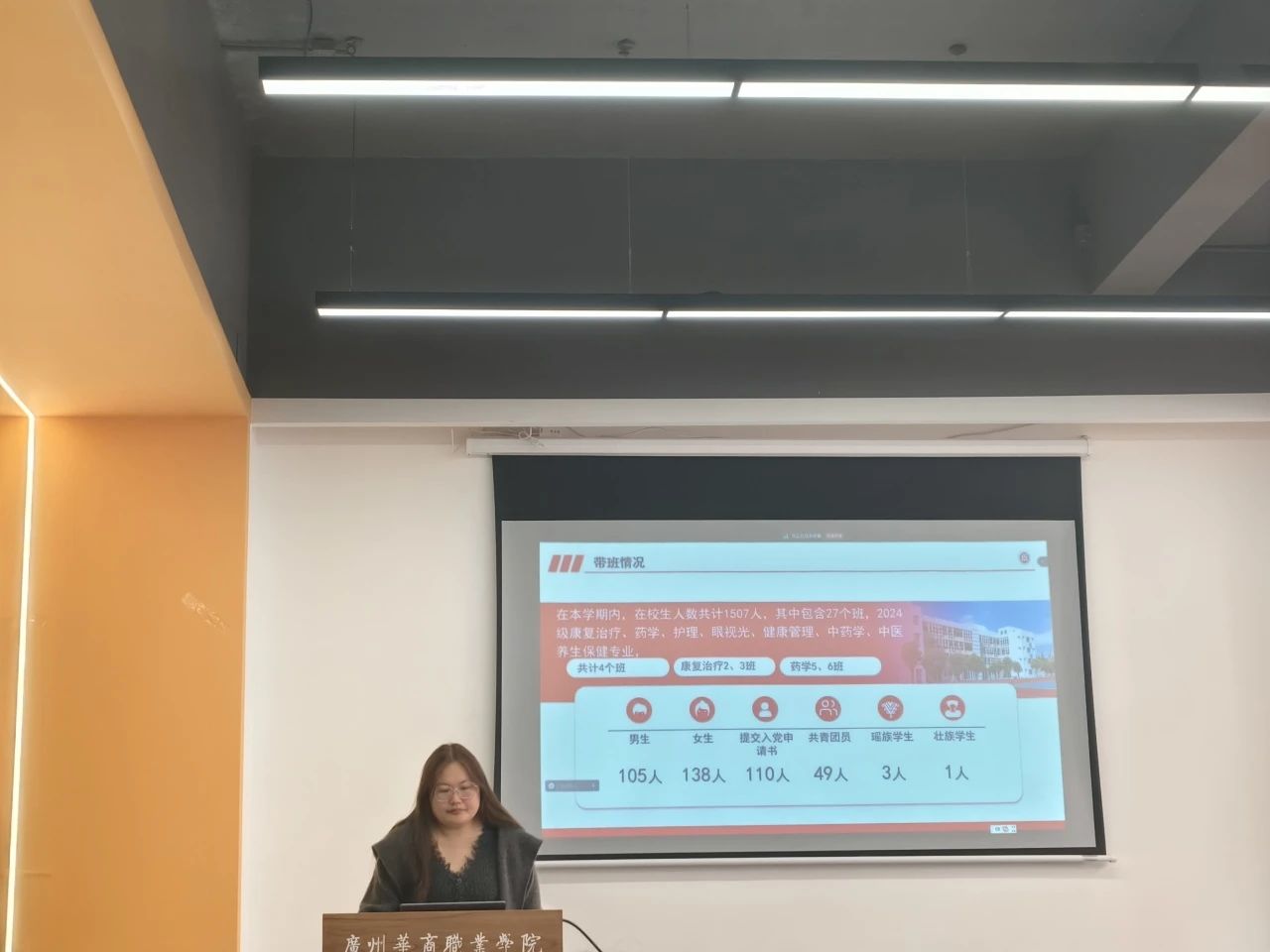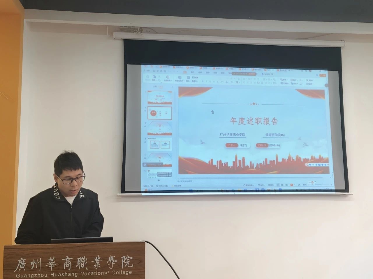 2024年1月2日下午14:30,健康医学院2024-2025第一学期辅导员述职报告会在博学楼B507(广州校区)和献章书院多功能报告厅(江门校区)举行,与会人员有健康医学院院长洪文艳、副院长黄泽栋、副院长叶雪兰以及两校区全体辅导员。本次会议旨在总结过去一学期的工作成果,交流经验,明确未来工作方向,进一步推动学院辅导员队伍的专业化、职业化建设。江门校区12名辅导员和广州校区10名辅导员依次上台,围绕党团建设、思想教育、学风建设、学生管理等多方面工作,进行了精彩纷呈的述职汇报。