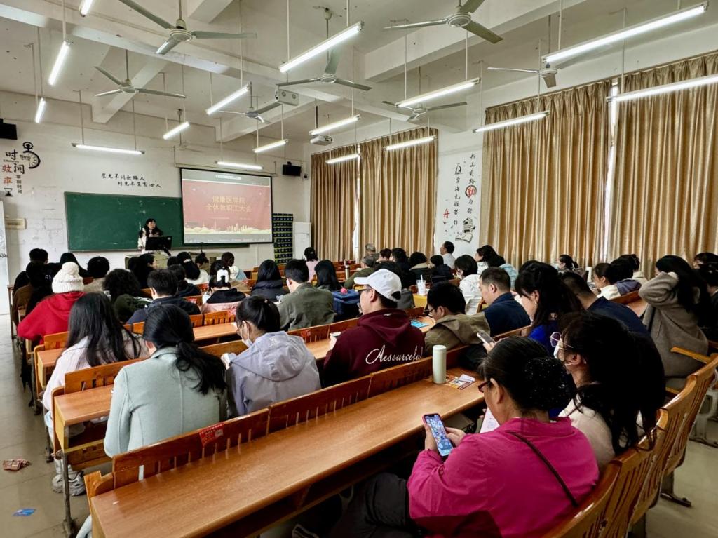 洪文艳院长带领全体教师学习校长年度工作报告,并强调三项重点工作:一是强化党建引领,要求各党支部制定科学务实的学期计划,推动党建与业务深度融合;二是深化课程思政建设,挖掘专业课程中的育人元素,构建全员全程全方位育人格局;三是树立“宣传人人有责”意识,号召教师主动参与学院品牌建设,讲好育人故事。