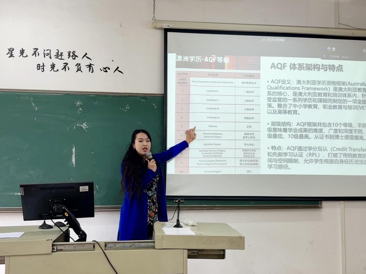 唐莉珊老师分享了赴澳学习心得,详细介绍了澳洲职业教育学历体系、跨文化共融课程设计理念及护理等专业学生海外就业前景,为学院国际化人才培养提供新思路。叶雪兰副院长结合分享内容提出要求:一是鼓励教师借鉴海外经验优化教学实践;二是严格督促22级实习周报批改,强化实践教学管理;三是推进校企深度合作,探索产教融合新路径。