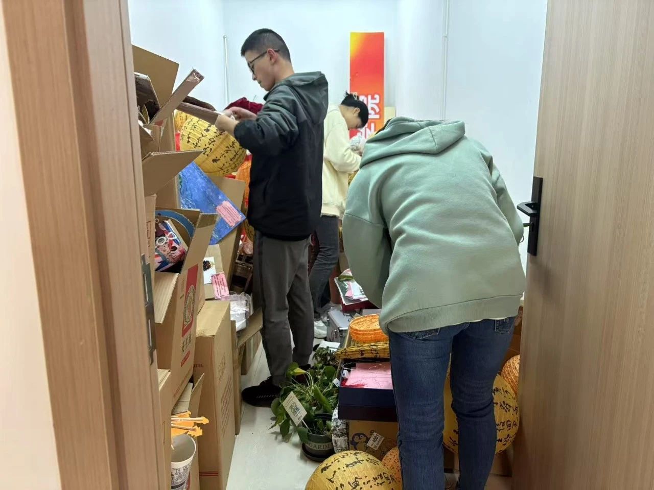 在物资室,志愿者们仔细清点各类活动物资、书籍资料和办公用品,对其进行分类整理,并搬运至合理规划的存储区域,为后续物资的调配提供便利。