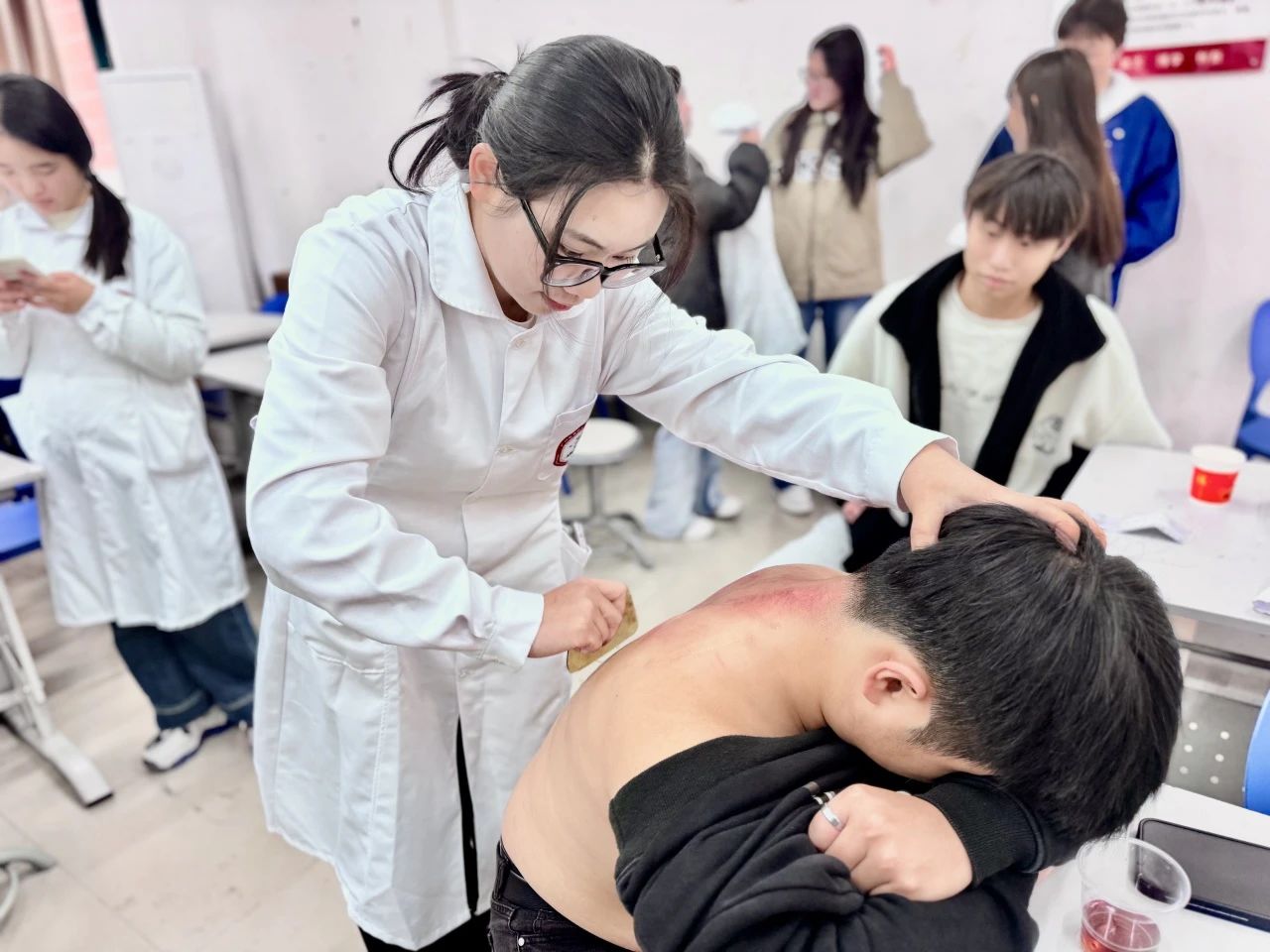 我院在博C103、104开展了女神节专场刮痧推拿体验活动。
