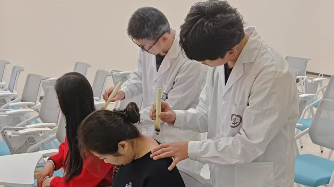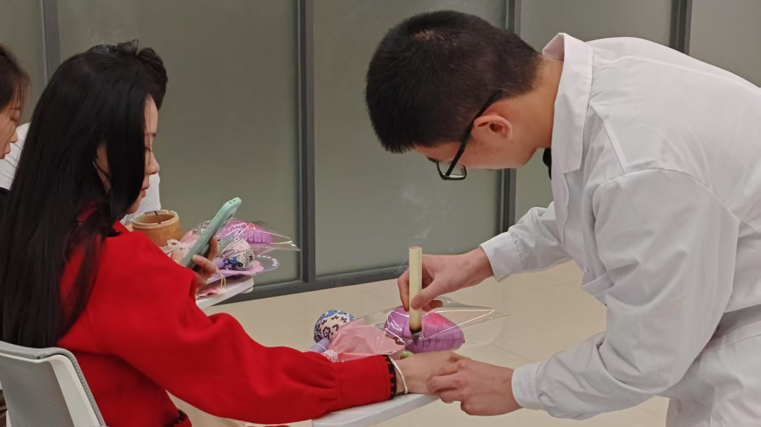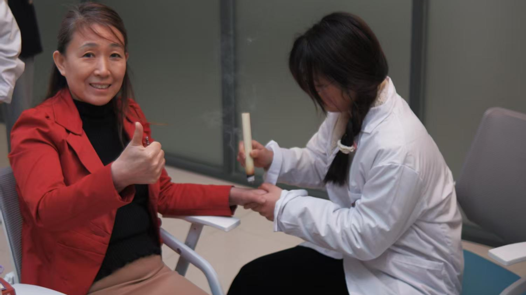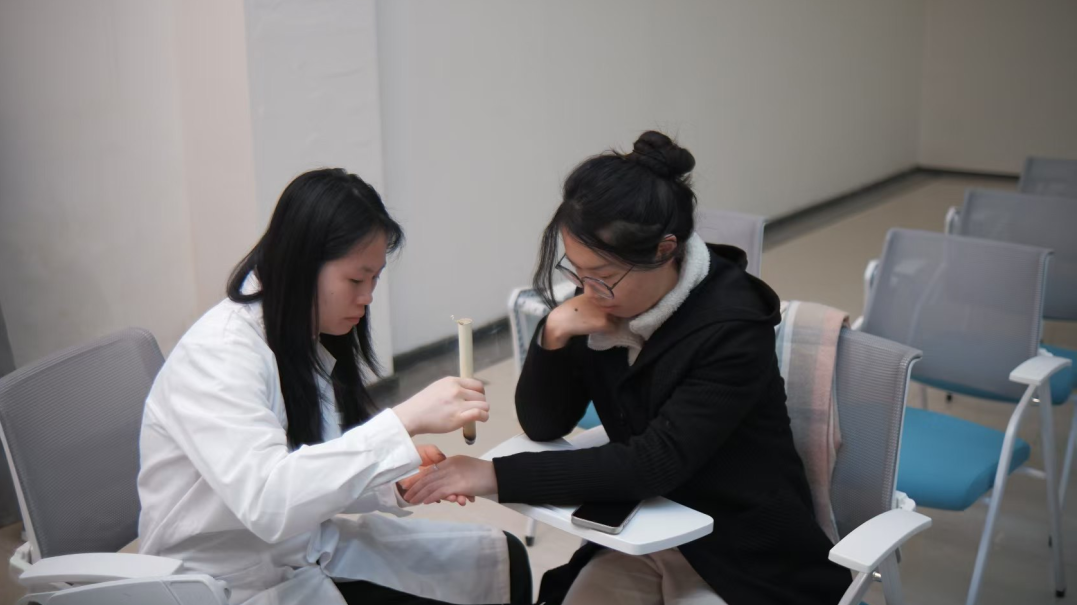 志愿者们在艾灸的同时,时刻关心老师们的感受,并耐心为老师们讲解艾灸的原理和注意事项,让大家在享受艾灸的同时学到一些中医养生知识。