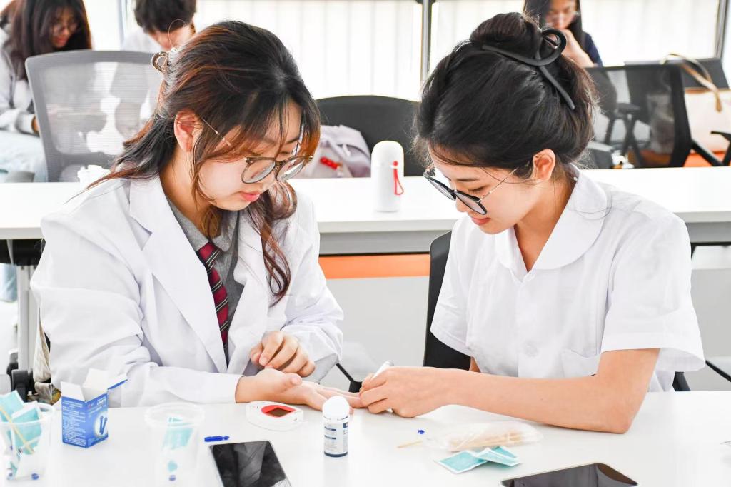 进入实践环节,队员们严格遵循老师的指导,有条不紊地进行操作。他们先用酒精棉片仔细擦拭无名指指腹,待酒精挥发后进行指尖采血。采血过程中,大家密切观察出血情况,随后准确读取测量数值。肖老师全程在旁,密切关注队员们的操作细节,及时给予辅导与纠正,确保每一位同学都能熟练掌握测量技能。