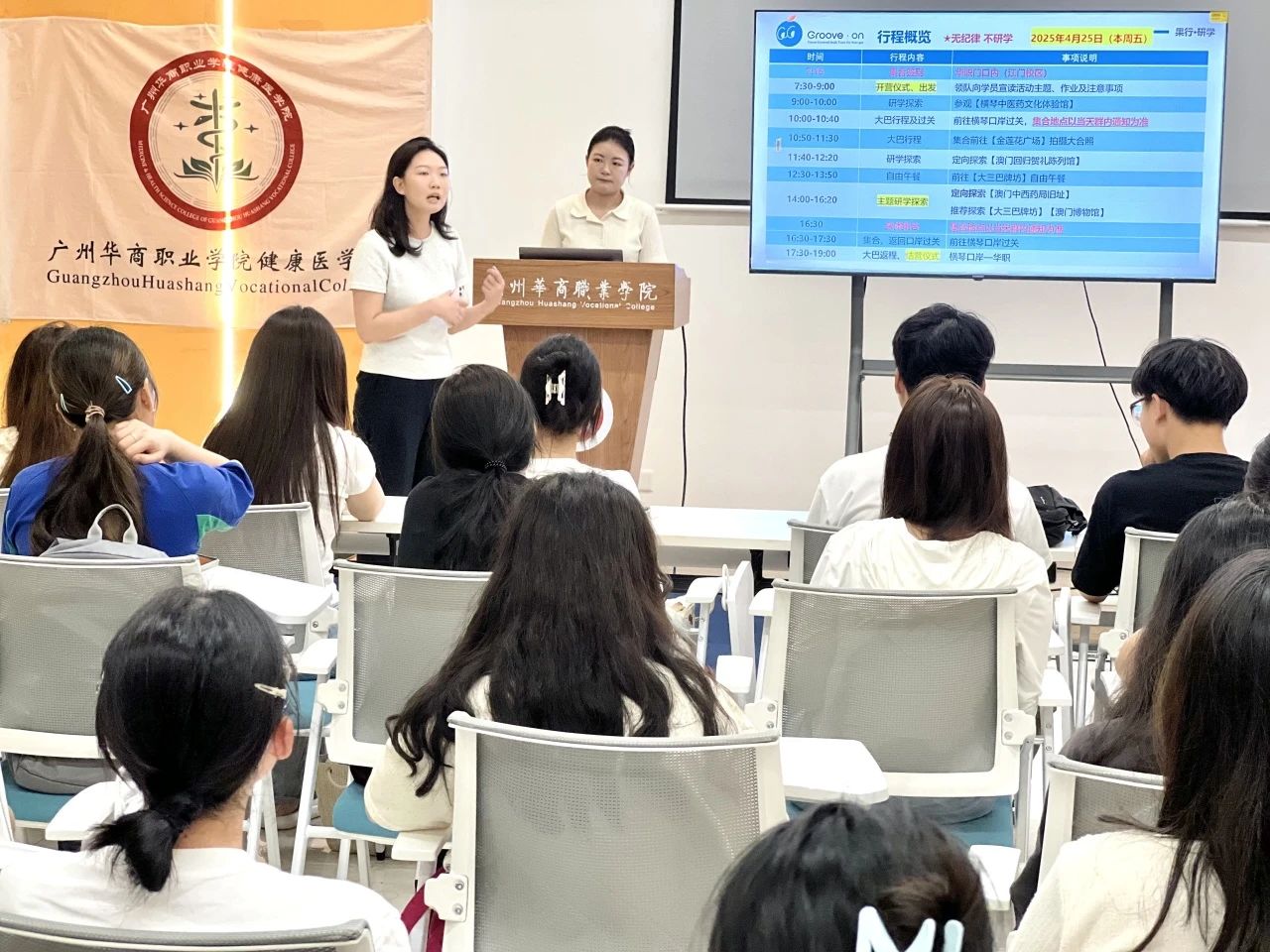 张璇老师向同学们介绍研学行程的具体安排:第一站:横琴粤澳合作中医药科技产业园,深入“中医药之魂”展区,解密千年中医药文化传承之谜。第二站:澳门回归贺礼陈列馆,回溯澳门回归重要历史,激发爱国情怀,共筑青春梦想,践行社会主义核心价值观。第三站:澳门中西药局旧址,探寻孙中山先生在澳门行医足迹,领悟医学实践与革命思想的交融,汲取孙中山精神,激励当代青年爱国奋斗。