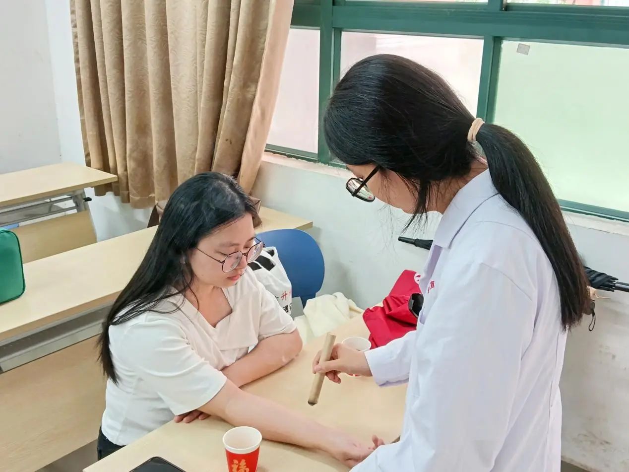 活动现场,专业的志愿者们各展所长,推拿、刮痧、艾灸、耳穴贴敷和养生花茶五大健康服务齐上阵。黄艳丹老师更是拿出把脉绝技,为前来体验的师生分析身体情况,并提供个性化健康指导,推荐他们体验不同的中医养生项目。