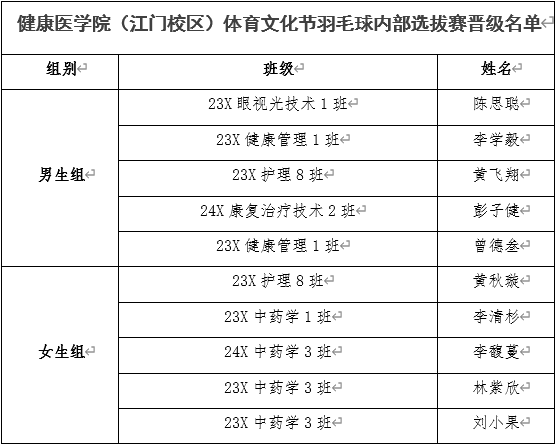 晋级选手将代表健康医学院(江门校区)参加5月校级羽毛球联赛,让我们一起为他们加油!同时也感谢本次羽毛球内部选拔赛裁判的专业与贡献!选拔赛虽已结束,但这仅仅只是一个开端。我们期待他们在即将到来的学校正式比赛,能够继续保持这种良好的竞技状态和拼搏精神,相信他们定会在正式赛场上再次绽放光芒,用他们的实力与汗水,在羽毛球的荣耀之路上镌刻下属于自己的深刻印记。