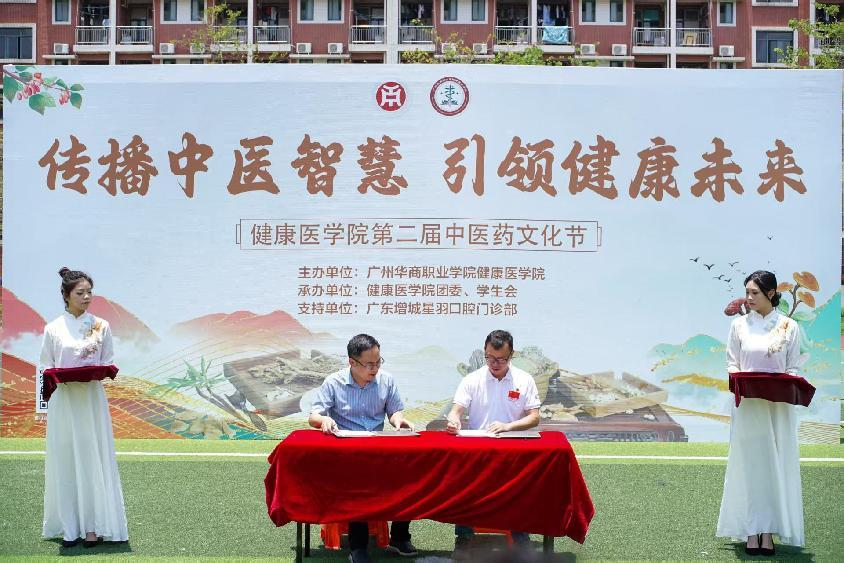 广州华商职业学院与广东增城星羽口腔门诊部签署校企合作框架协议,并授予“广州华商职业学院校外实践教学基地”牌匾。
