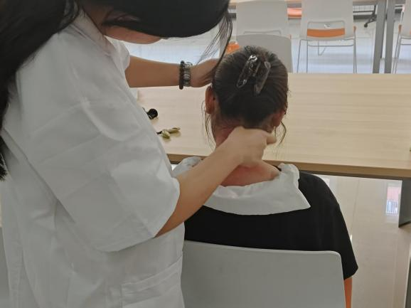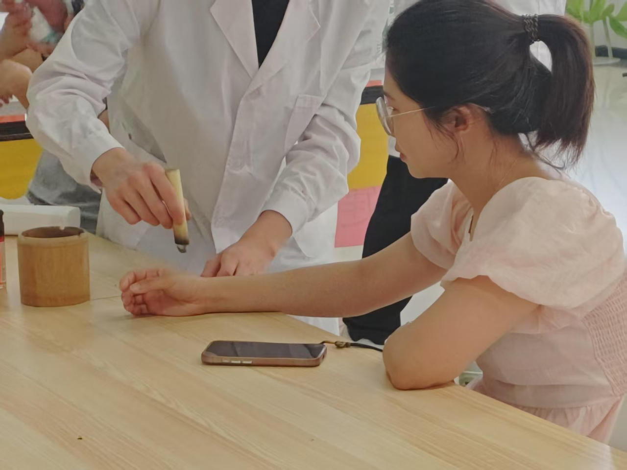 在刮痧区域,志愿者们通过刮痧板在特定经络和穴位上进行刮拭,帮助教职工们疏通经络、促进血液循环、缓解肌肉疲劳。不少长期伏案工作、肩颈酸痛的老师在体验后纷纷表示,肩颈部位瞬间轻松了许多,僵硬感明显减轻。
