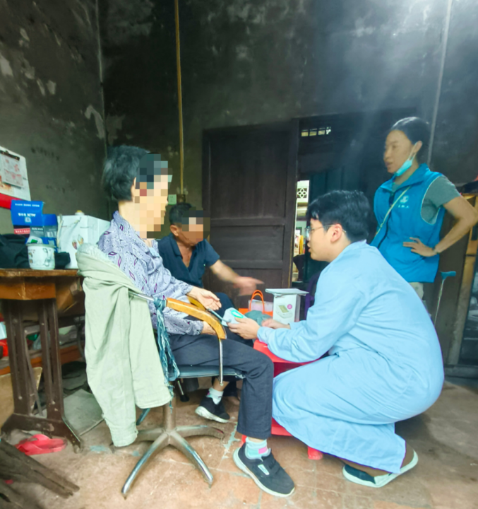活动伊始,当地社工黄小结向志愿者们详细介绍了长者的健康状况和生活需求。在黄社工的引导下,志愿者来到长者家中,受到了热情欢迎。冯老师首先对长者的身体状况进行了专业评估,周铭钊同学随后为长者测量血压,确保后续康复训练的针对性和安全性。