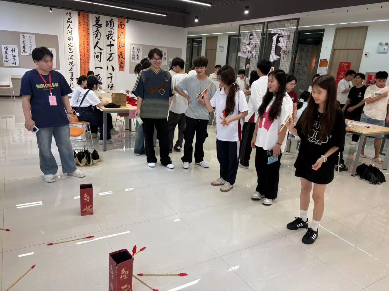 趣味游戏区人气爆棚。在“粽子保龄球”游戏中,参与者手持粽子沙包或软球,瞄准矿泉水瓶奋力投出。大家全神贯注,都想全部投中,现场氛围热烈。投壶游戏也备受欢迎,参与者手持箭矢,投向对应的壶里,感受传统游戏的独特魅力。不少同学在尝试后发现了自己的投壶天赋,成功通关后满脸喜悦。