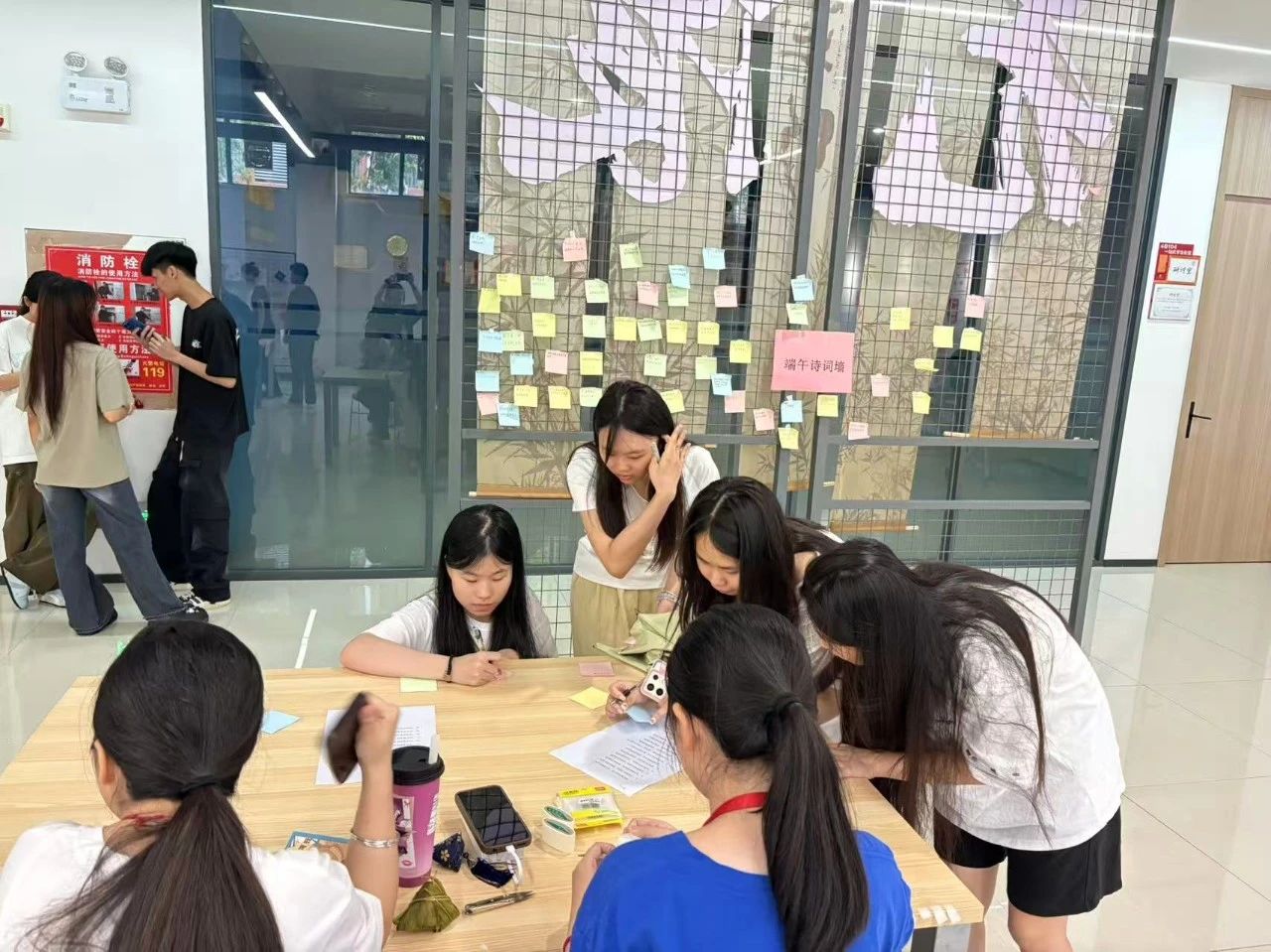 活动现场,端午诗词墙成为文化交流的小天地。同学们认真摘抄经典诗词,然后将作品贴在墙上展示。不同的字迹、各异的诗词内容,让诗词墙成为一道独特的风景线。不少参与者在欣赏他人作品时,还与同学交流诗词感悟,实现了跨越诗句的灵魂对话。