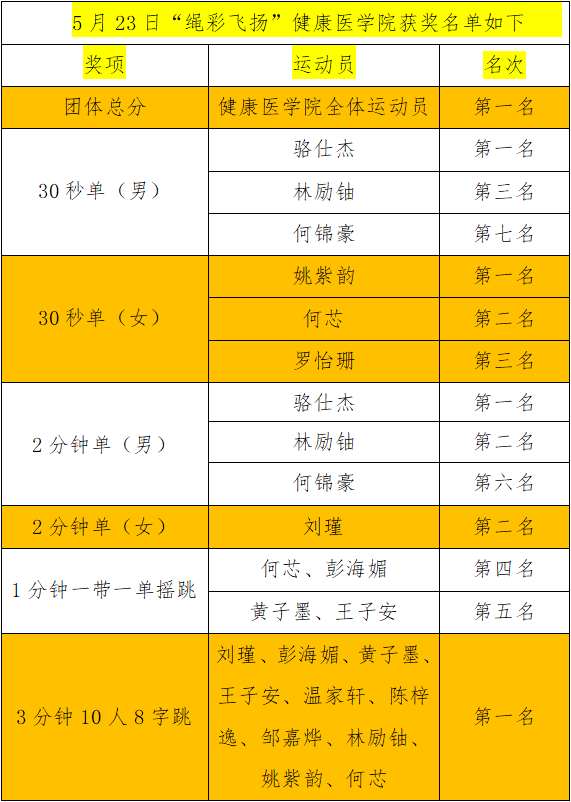 5月23日,“绳彩飞扬”跳绳比赛于弘美楼一楼盛大开幕。来自全校各个班级的跳绳健儿们齐聚一堂,用速度与激情,编织出一幅活力四溢的青春画卷。健康学子们积极踊跃地投身赛事,在赛场上凭借卓越不凡的表现,于多个项目中脱颖而出,斩获前三名的佳绩,最终更是以显著优势摘得团体总分第一的桂冠。