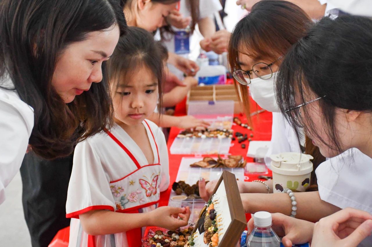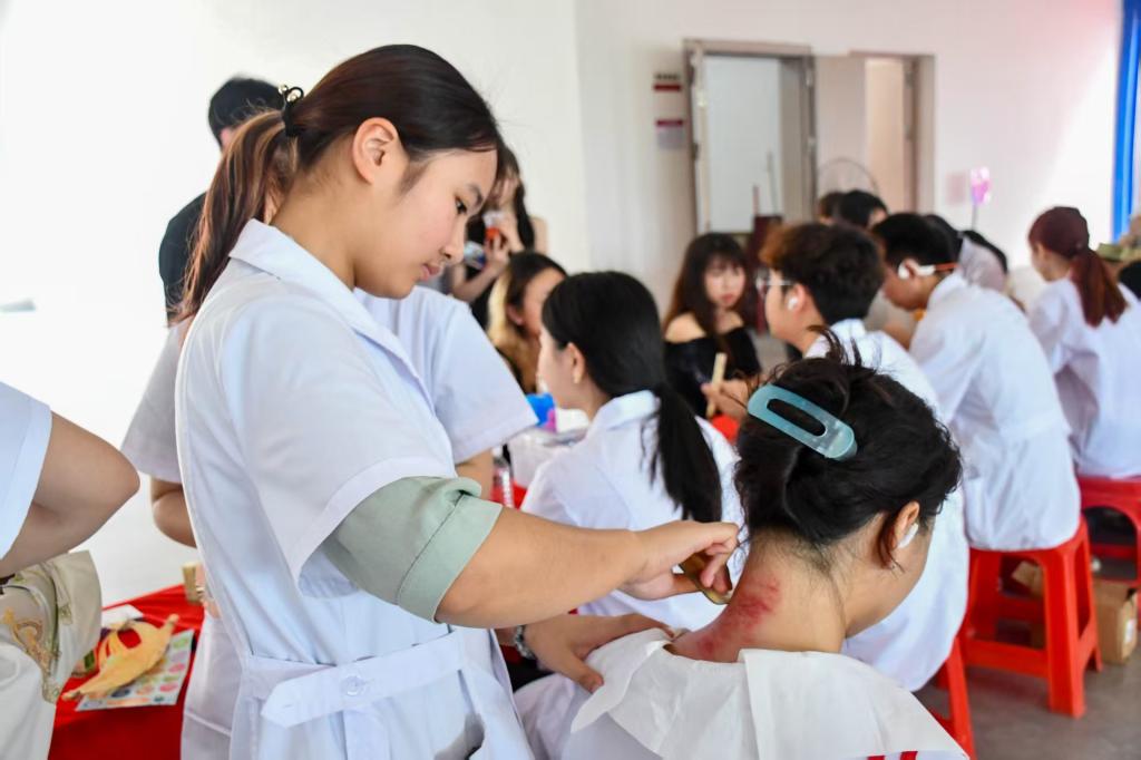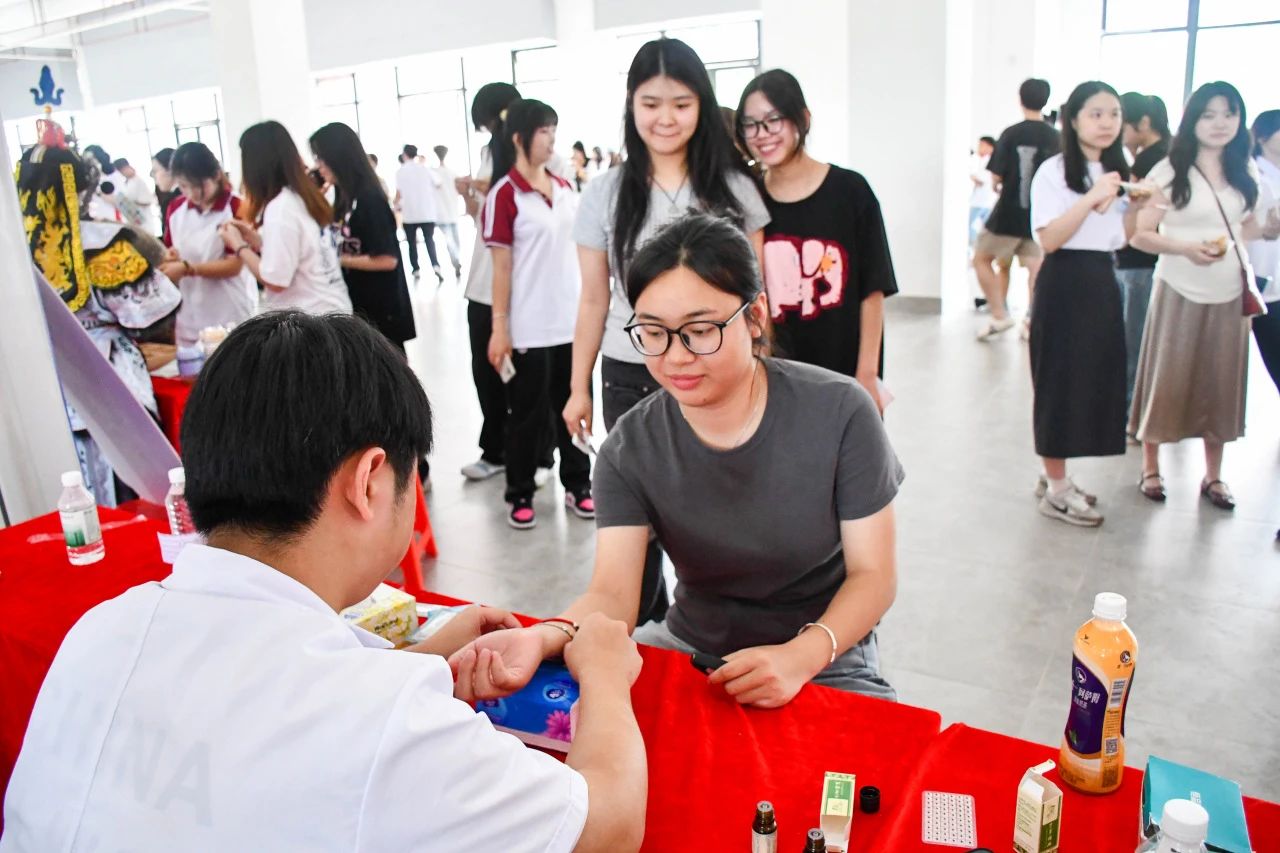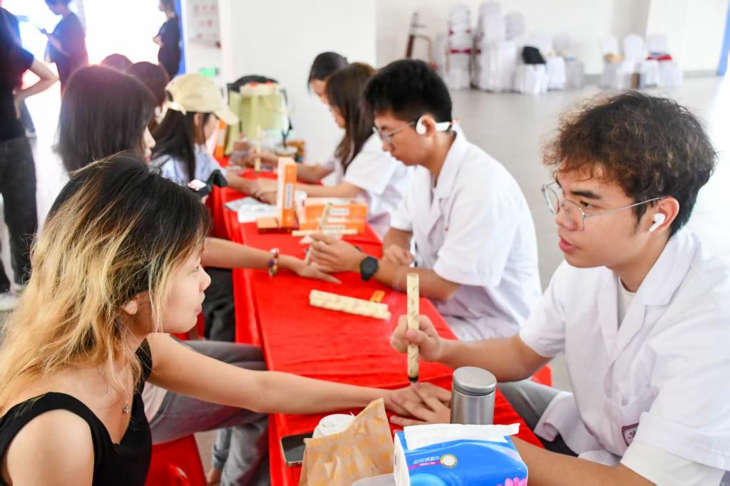 在健康医学院的摊位前,师生们络绎不绝,纷纷驻足体验艾灸、刮痧项目,并参与中药耳环手串制作。