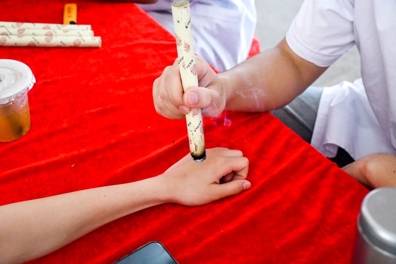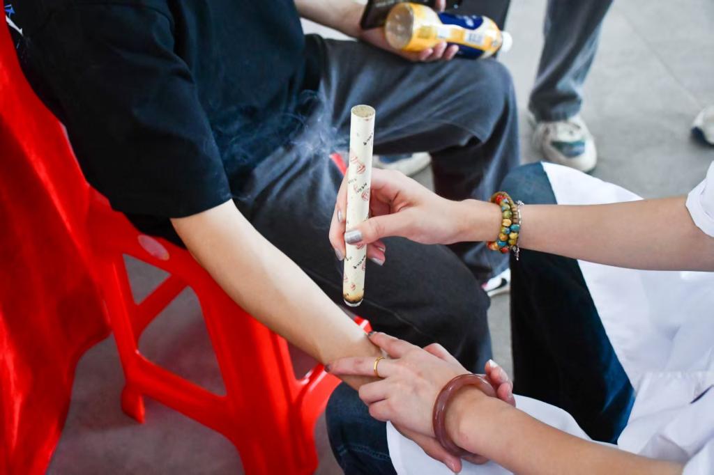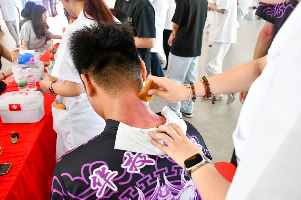 艾灸刮痧体验站中,志愿者现场施灸,艾香袅袅,温热感透过穴位传递,助你感受传统疗法魅力、了解养生功效。