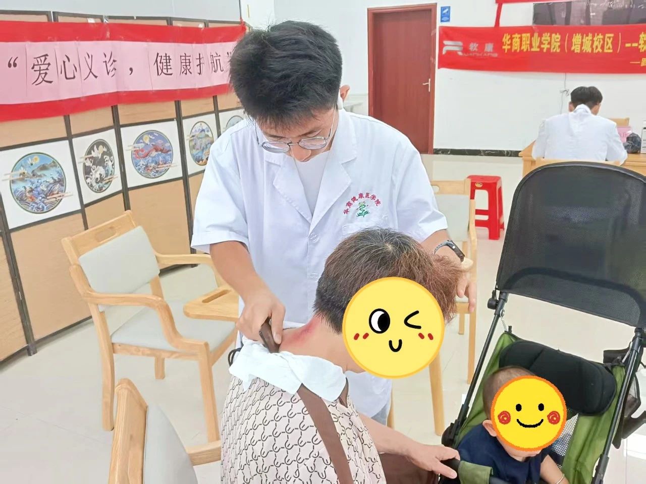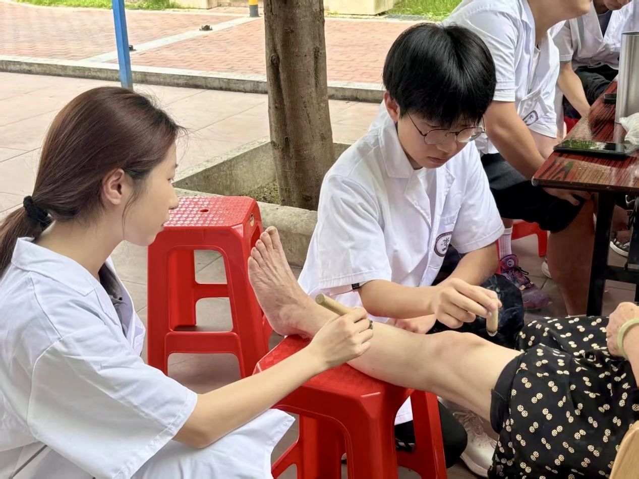 我校软组织康复技术培训班专家讲师黄艳丹亲自到场,为前来体验的村民分析身体情况,让他们进一步测量血糖、血压,并提供个性化健康指导,推荐他们体验不同的中医养生项目。