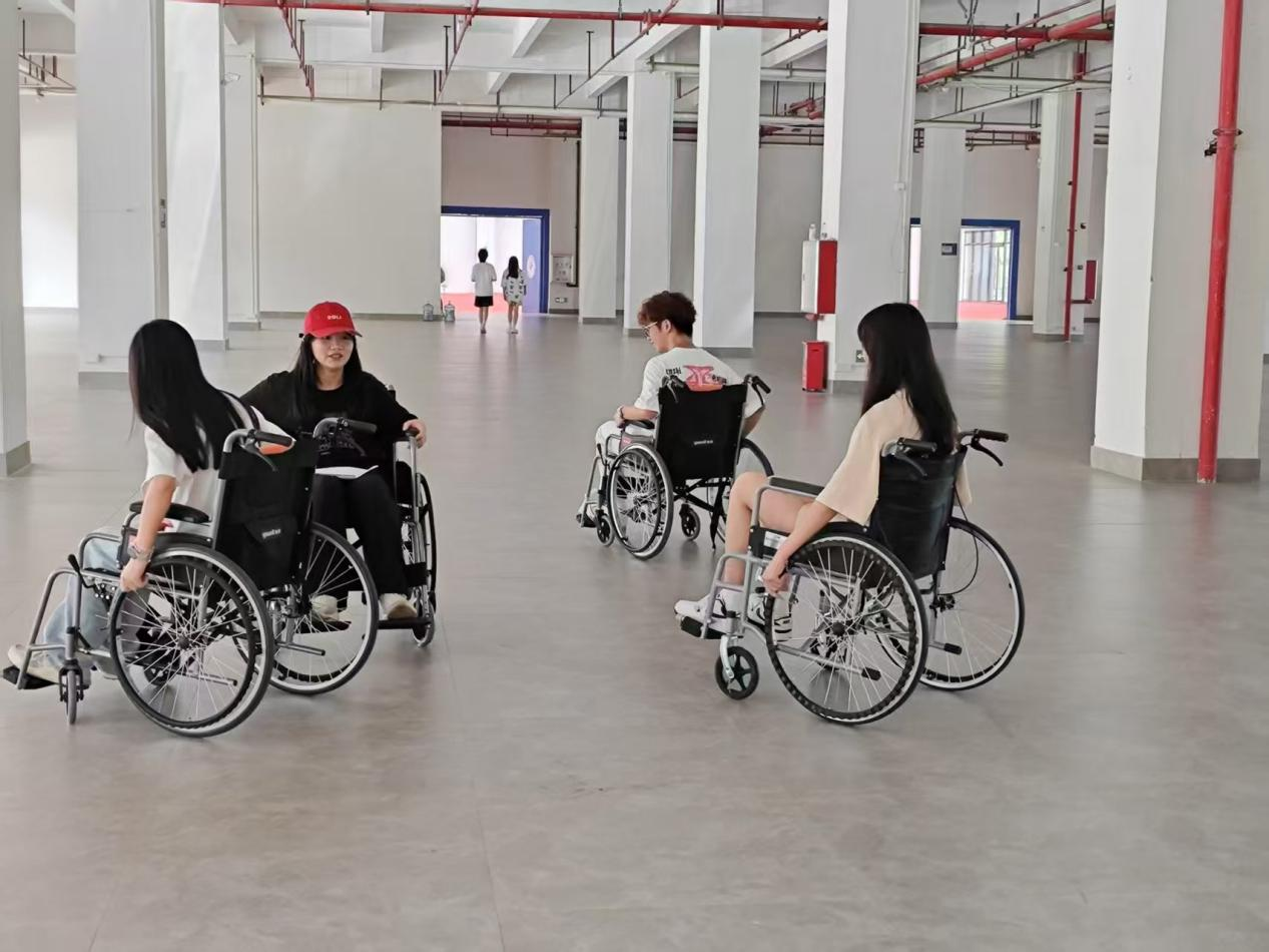 2. 轮椅体验:方寸之间,感受行动的不易。平坦的路面、台阶、斜坡……看似平常的环境,对轮椅使用者来说却充满挑战。参与者们坐上轮椅,完成“穿越障碍”“购物模拟”等任务,切身感受到转身、上下坡、开门等动作的艰难。