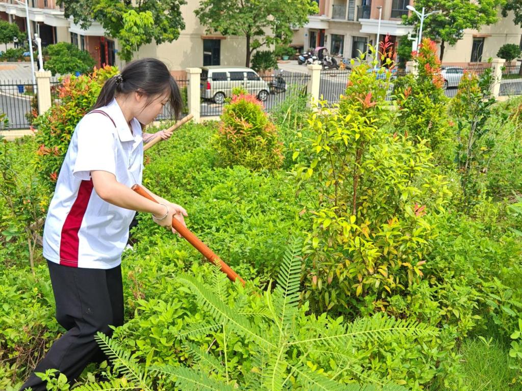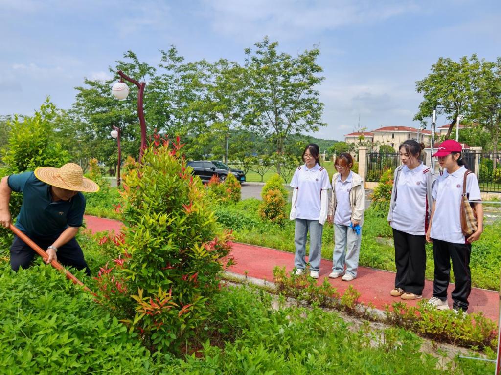 活动当天,村长率先拿起锄头,在田埂上示范除草技巧:“除草要贴着根割,不然杂草还会再长;一定要轻轻地,注意安全……”他一边讲解,一边手把手教队员们分辨杂草与农作物,传授高效除草的“土方法”。队员们听得认真,学得专注,很快就掌握了要领。