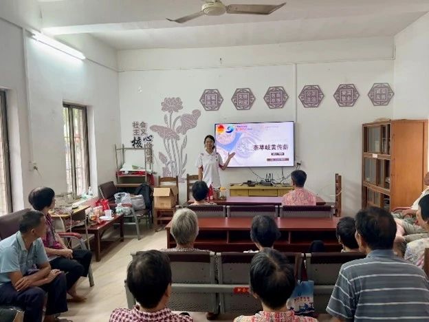 义诊的余温尚在,7月12日,一场主题为“健康智慧颐耆年”的中医药养生健康宣讲会又在水背村开讲。突击队员们结合前一日义诊的实例,将实用的健康知识送到了村民身边。