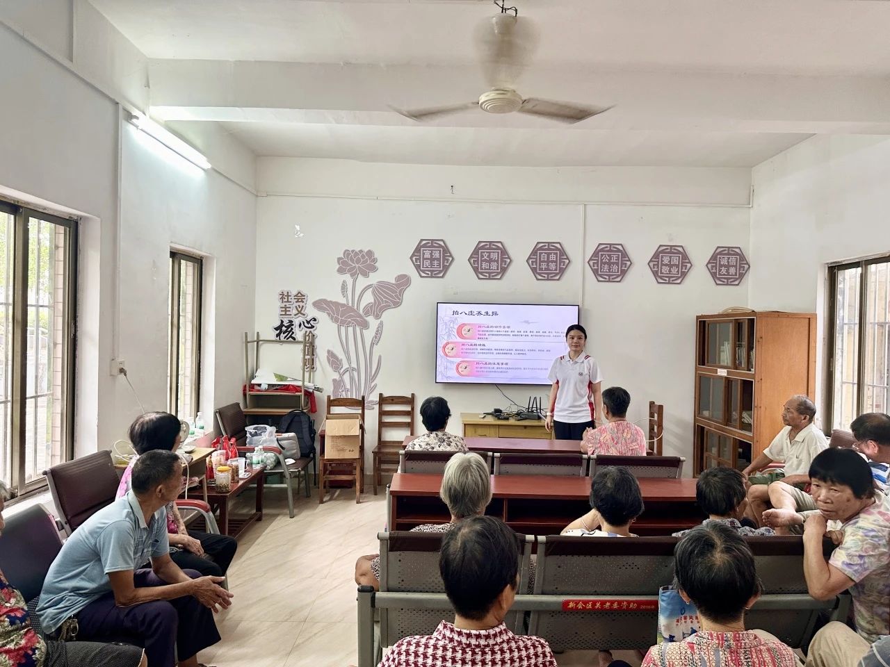 活动现场,队员们不仅细致讲解拍打肘窝、腋窝、腹股沟、腘窝这“八虚”的要领及其疏通经络、调和气血的养生功效,更亲身示范,一招一式,耐心引领。