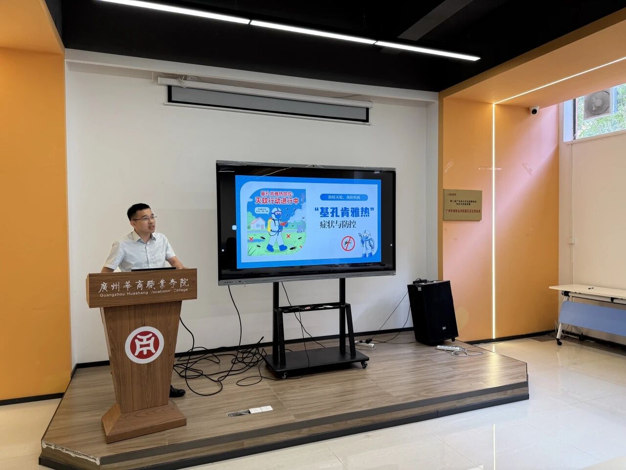 随后,黄泽栋副书记围绕基孔肯雅热的疾病概况、传播机制、临床症状、预防核心措施等方面进行了深入浅出讲解。他结合江门本地情况,着重分析了伊蚊的滋生习性与活动规律,并详细示范和讲解了如何有效清理积水、识别蚊虫孳生地、正确使用防蚊驱蚊用品等实用技能,为后续各班开展主题班会提供了坚实的知识基础和宣讲范本,最后,他要求将本次培训所学的知识和技能原原本本、清清楚楚地传达给每一位同学,确保全院上下对基孔肯雅热疫情形成统一、正确的认识,并动员大家共同参与以“防蚊灭蚊”为核心的爱国卫生活动,筑牢校园防疫屏障。