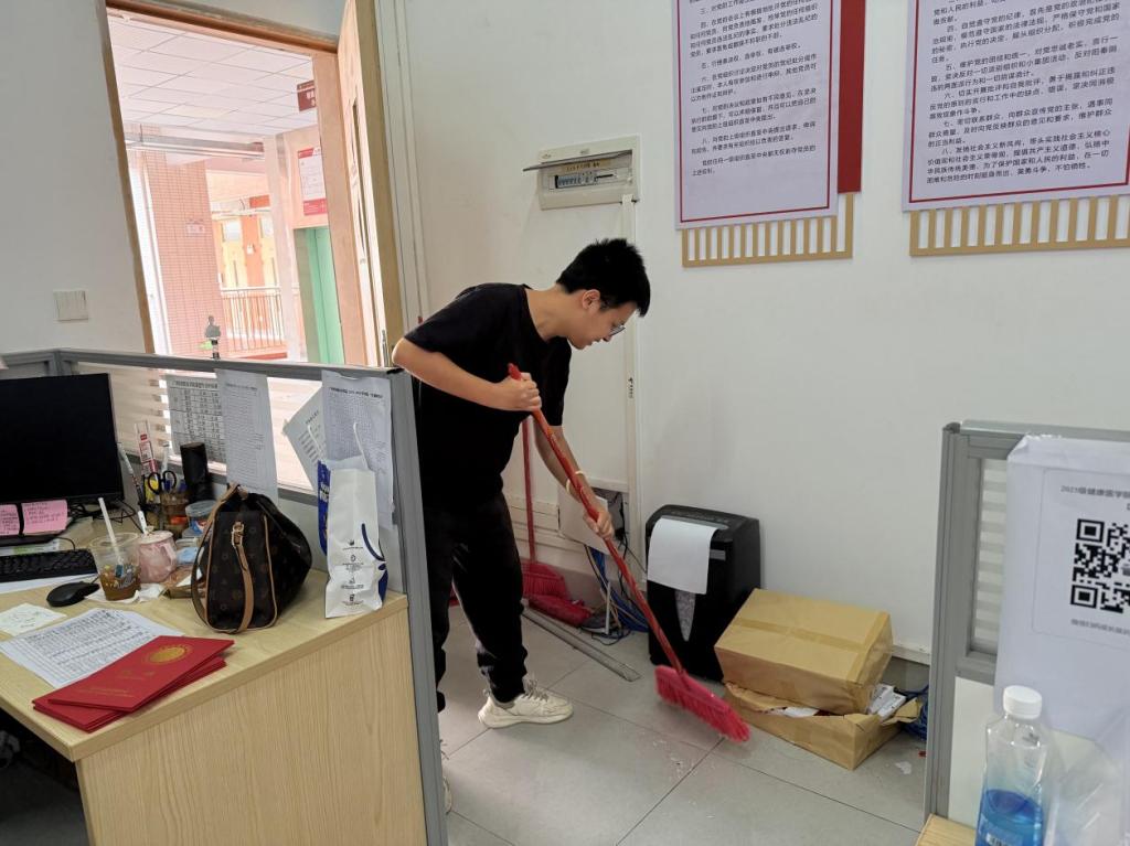 为深入贯彻落实新时代爱国卫生运动的重要精神,营造整洁优美、健康和谐的办公育人环境,以崭新的面貌迎接新学期,2025年9月1日,健康医学院积极响应上级号召,组织全体辅导员与行政人员在学院办公区域集中开展了环境卫生清扫活动。