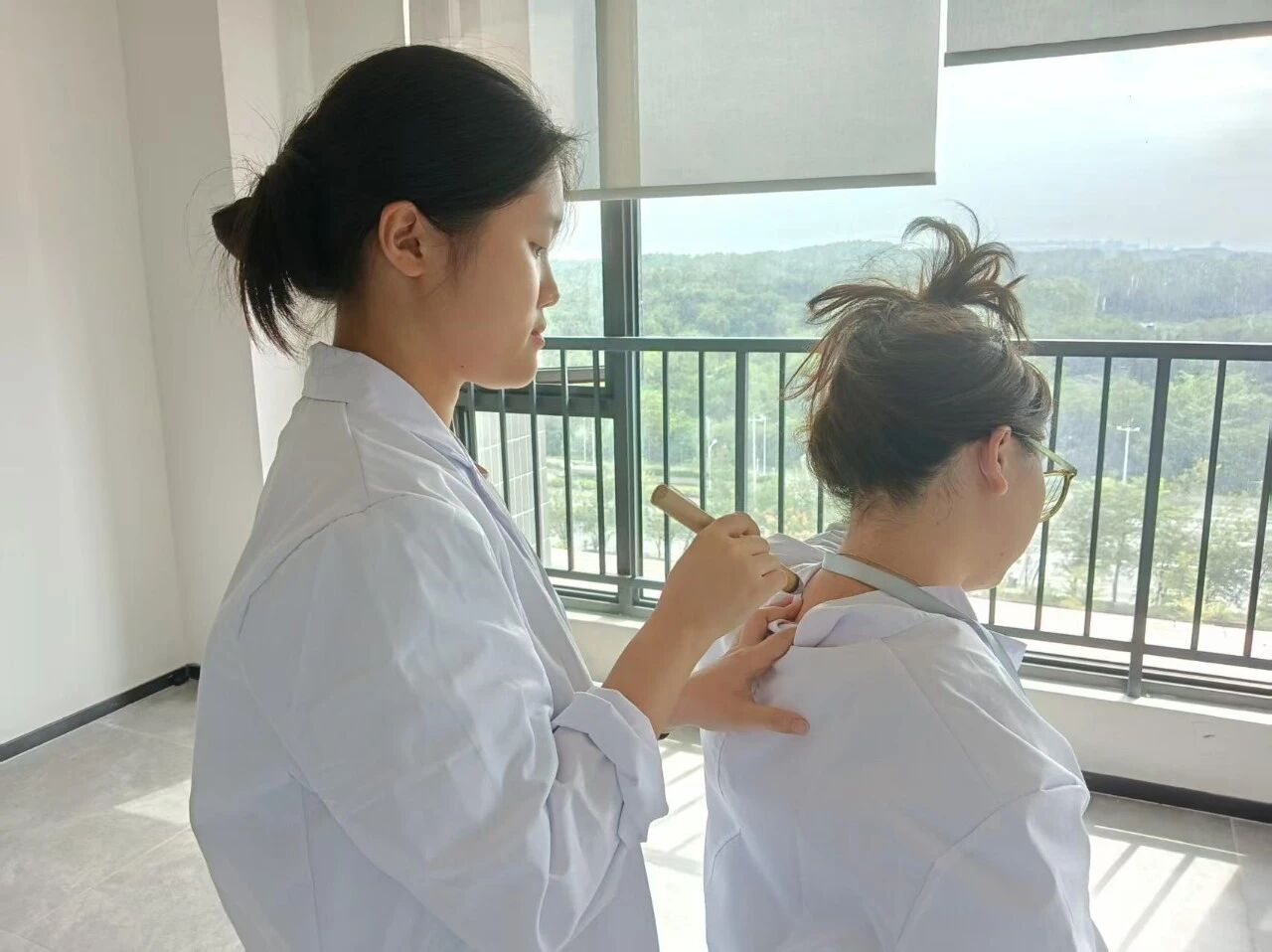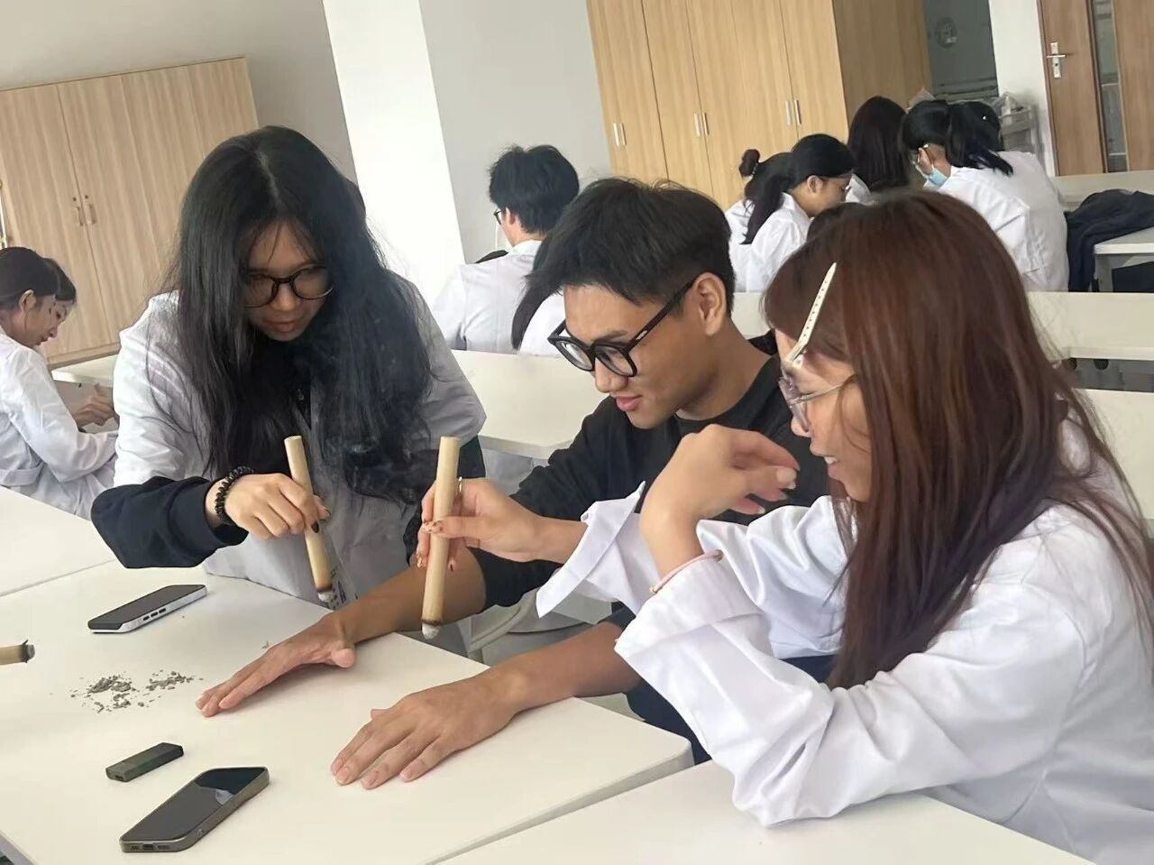 在实操环节,队员们自由组队,两两互练。现场氛围专注而热烈,王子允队长穿梭在各组之间,从艾条的握持角度、与皮肤的安全距离,到施灸时长的把控,逐一进行细致指导。队员们积极交流心得,互相分享感受。