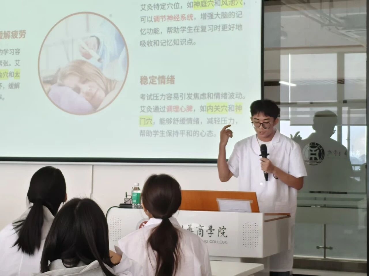 课堂伊始,王子允队长为队员们详细讲解了艾灸的四种基本手法:悬灸法、回旋灸、雀啄灸和温和灸。当队长讲到操作要点与作用时,队员们纷纷拿出笔纸记录重点,便于课后加深记忆。