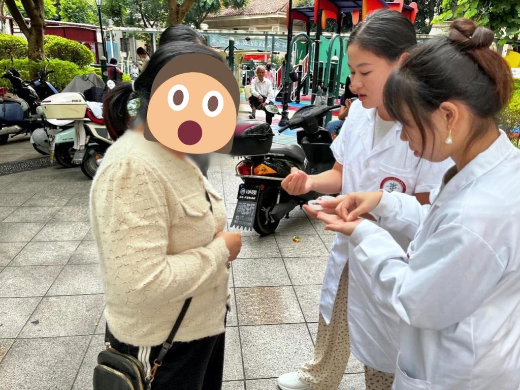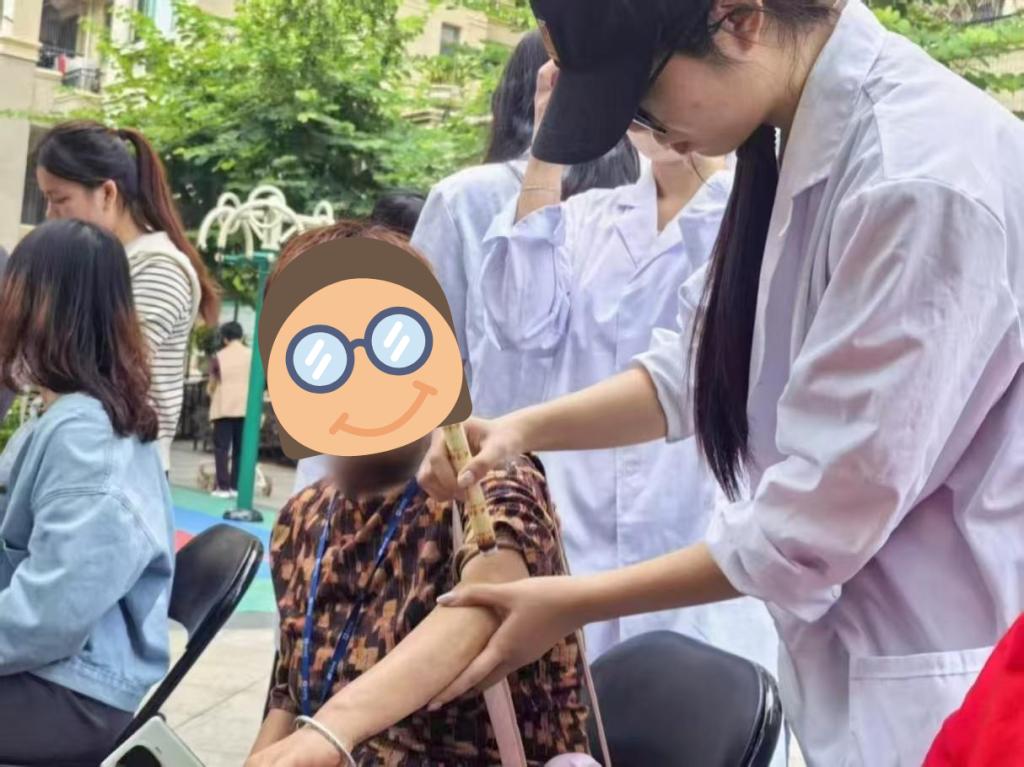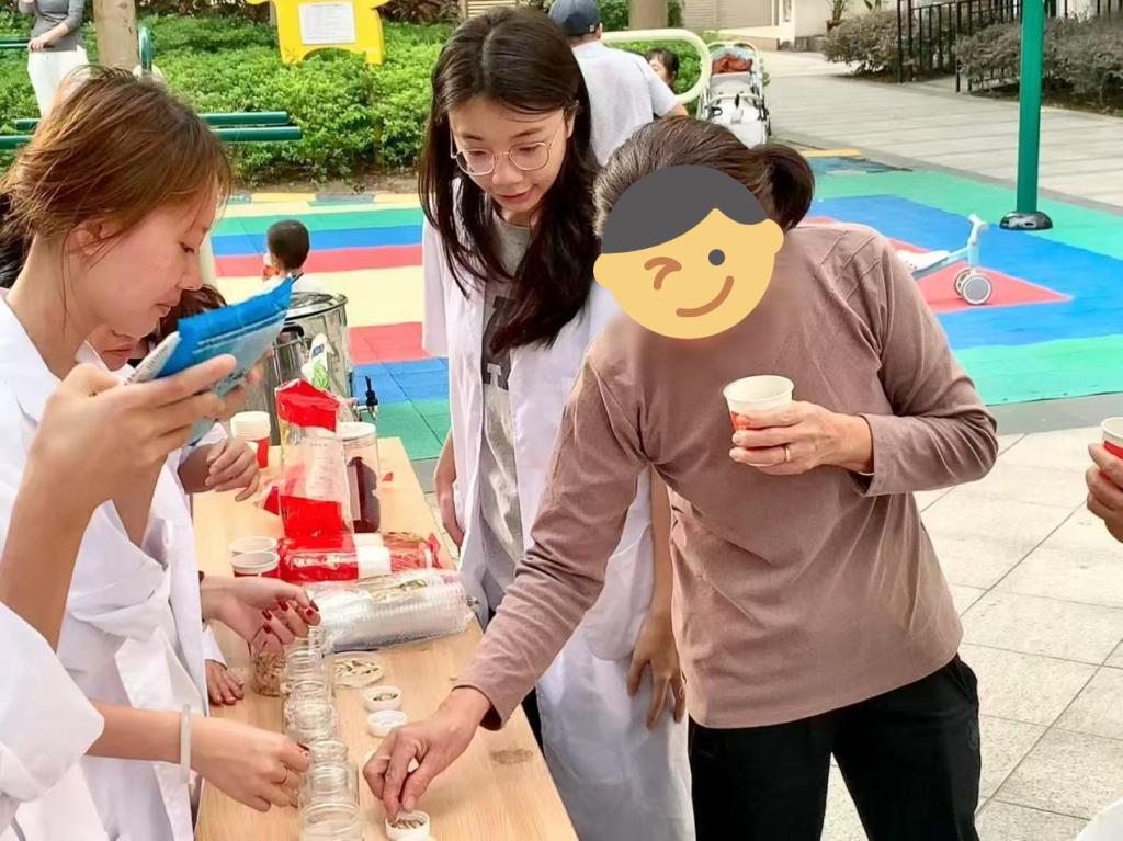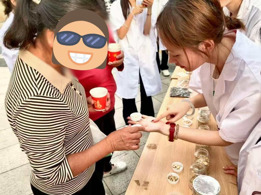 在健康服务区,志愿者们不仅提供艾灸体验,耐心讲解养生原理并示范穴位操作,帮助居民缓解肩颈不适,还设置了血压监测服务,细致测量并贴心提供个性化健康建议。一句句“阿姨,您血压偏高,平时注意清淡饮食”的叮嘱,让居民在体验温暖服务的同时,也更关注自身健康。活动还特别准备了师生精心熬制的山楂玫瑰花茶饮,酸甜口感与养生功效兼具,收获了居民的一致好评。