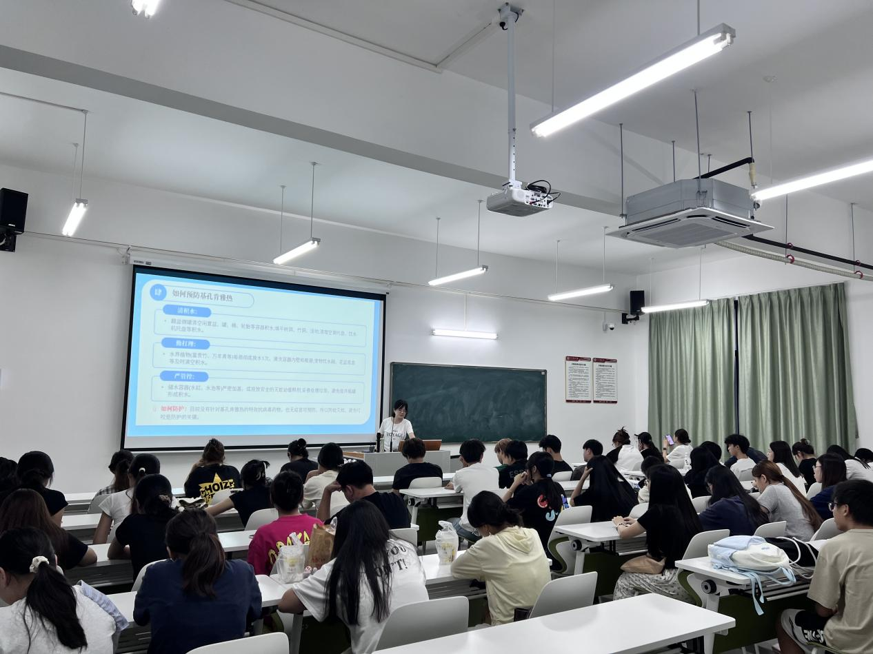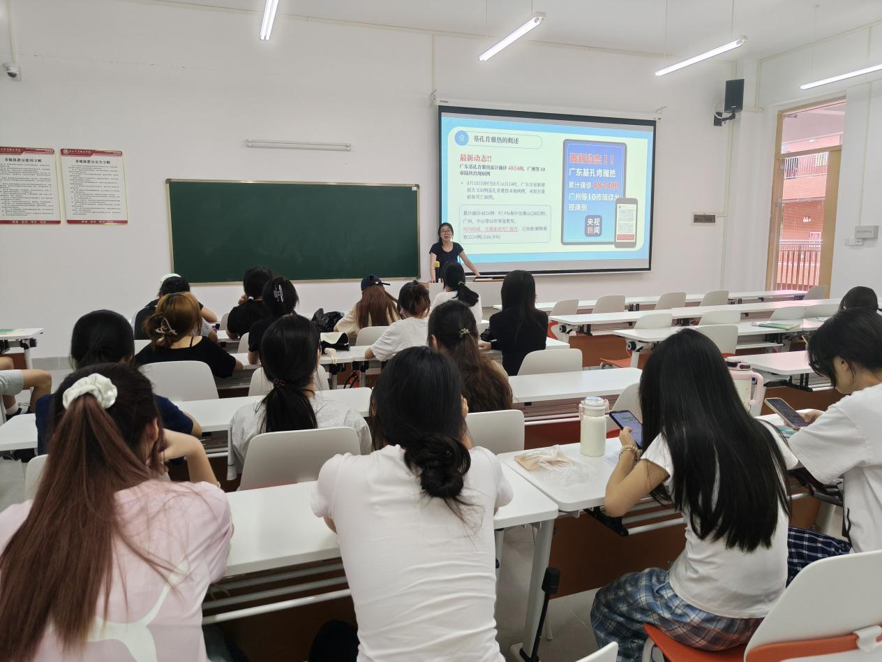 近期,广东省部分地区出现基孔肯雅热本地病例,为增强学生对蚊媒传染病的认识与防范能力,班会首先从疾病科普入手。班主任向同学们系统介绍了基孔肯雅热的病原特点、传播途径——主要由白纹伊蚊和埃及伊蚊叮咬传播,以及典型症状,如急起高热、剧烈关节疼痛和皮疹等。强调目前该病尚无特效药物和疫苗,因此“防蚊灭蚊”是阻断传播的关键。