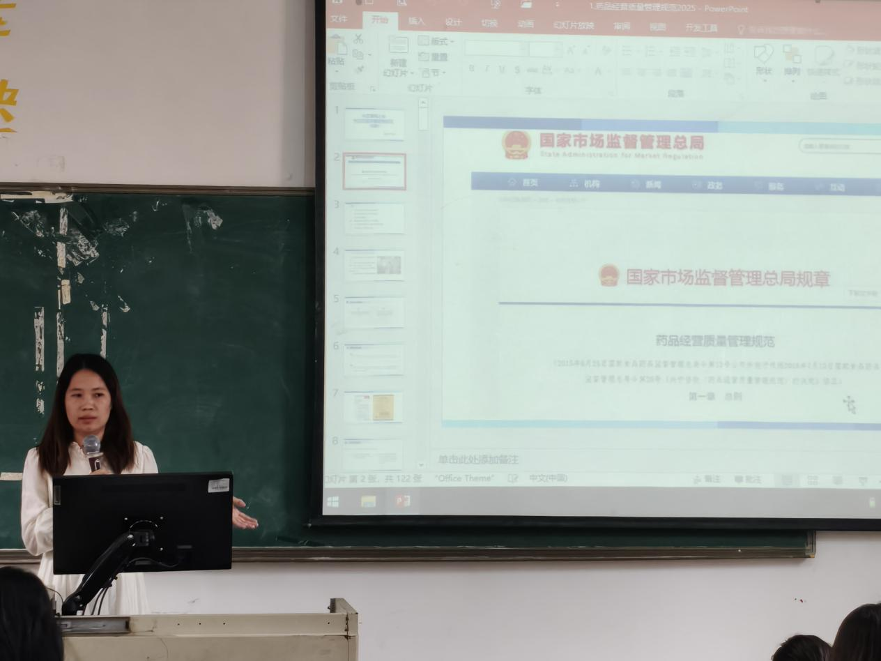 坚持岗位需求为导向,实现理论知识与操作技能的无缝对接,助力学生就业,2025年10月29日,健康医学院特邀广州绿色医药集团有限公司副总经理宋文凤为23药学1班学生举办《药品经营管理规范(GSP)》专题讲座。此次讲座旨在让学生清晰认识GSP在药店运营中的核心地位,提升对规范的认知与敬畏之心,并将诚信经营和质量意识深植于职业信念。
