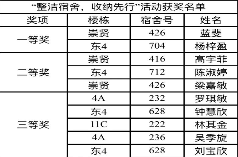 为进一步强化宿舍管理,营造整洁有序、温馨舒适的生活环境,提升同学们的生活品质与幸福感,健康医学院生活权益部于10月1日至17日举办了以“整洁宿舍,收纳先行”为主题的宿舍收纳活动。获奖名单如下: